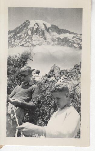 Mt. Rainier - Two Men standing at the Base of Mt. Rainier