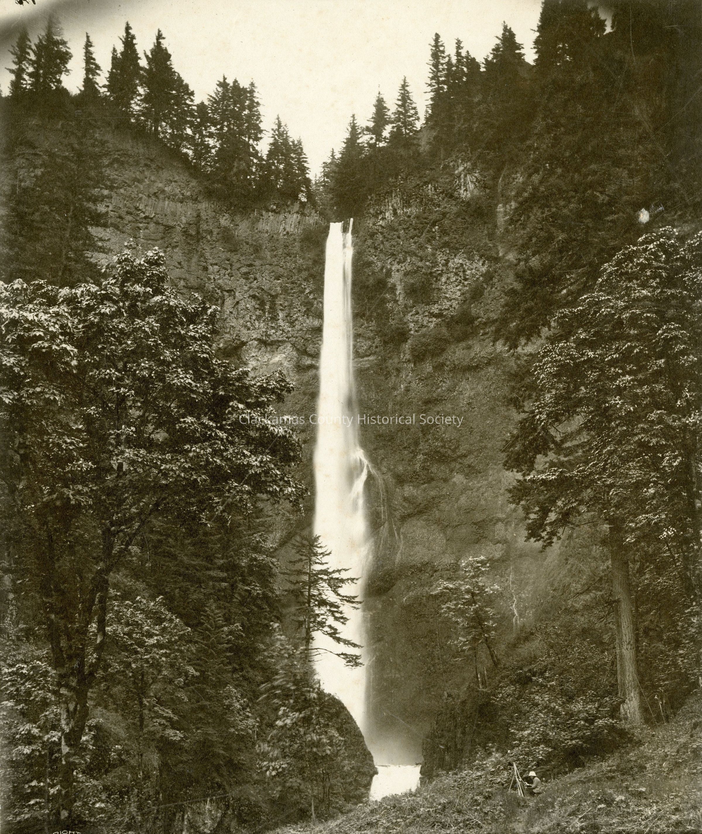 Multnomah Falls, Columbia Gorge, Oregon, 1920s. On the front, the photo states it was copyrighted in 1899. In the foreground, there is an artist painting the falls. Photo by Benj A Gifford.Made/Created
