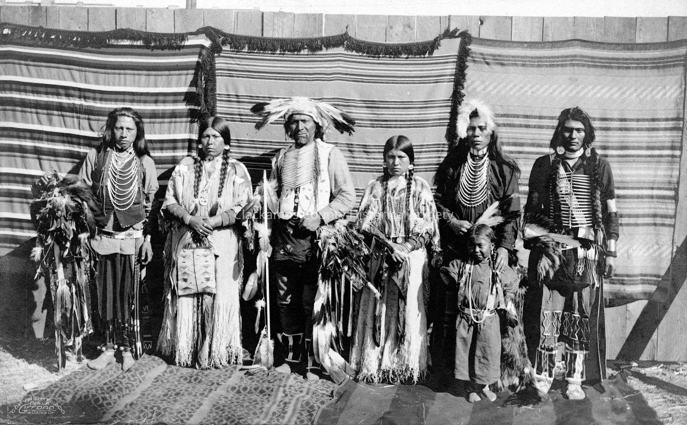 Native American Group posed in traditional clothing. 7 people. I-0525.000969 Duplicate photo indicates Cayuse Tribe)