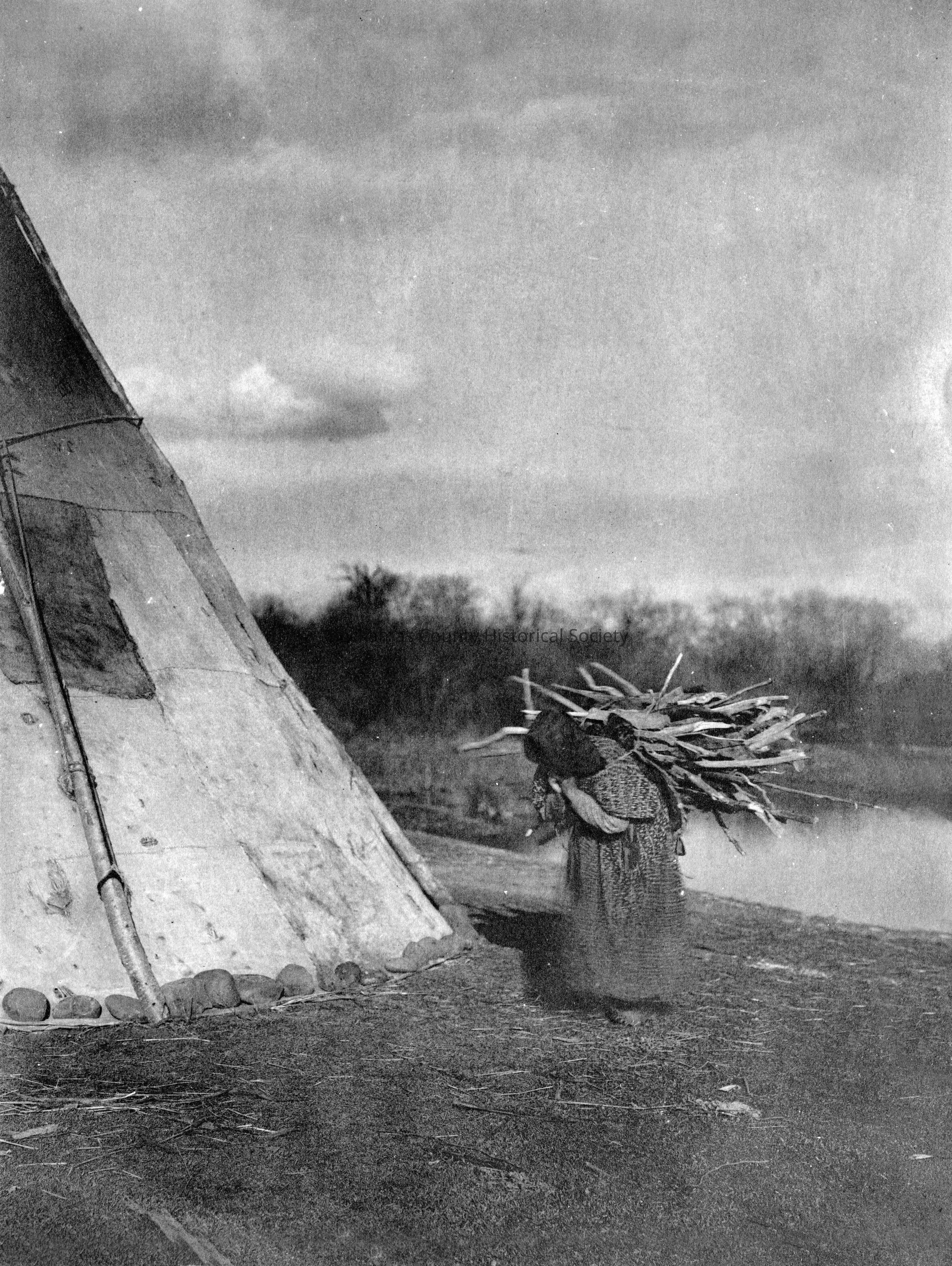 Native American Woman carrying wood "faggots". Teepee and water in background.