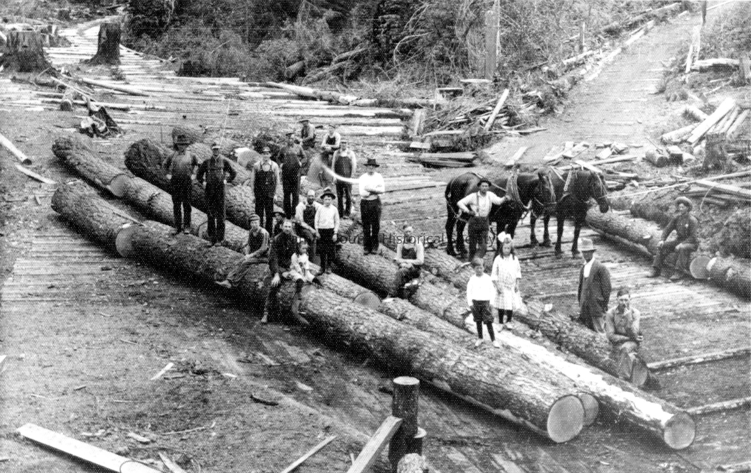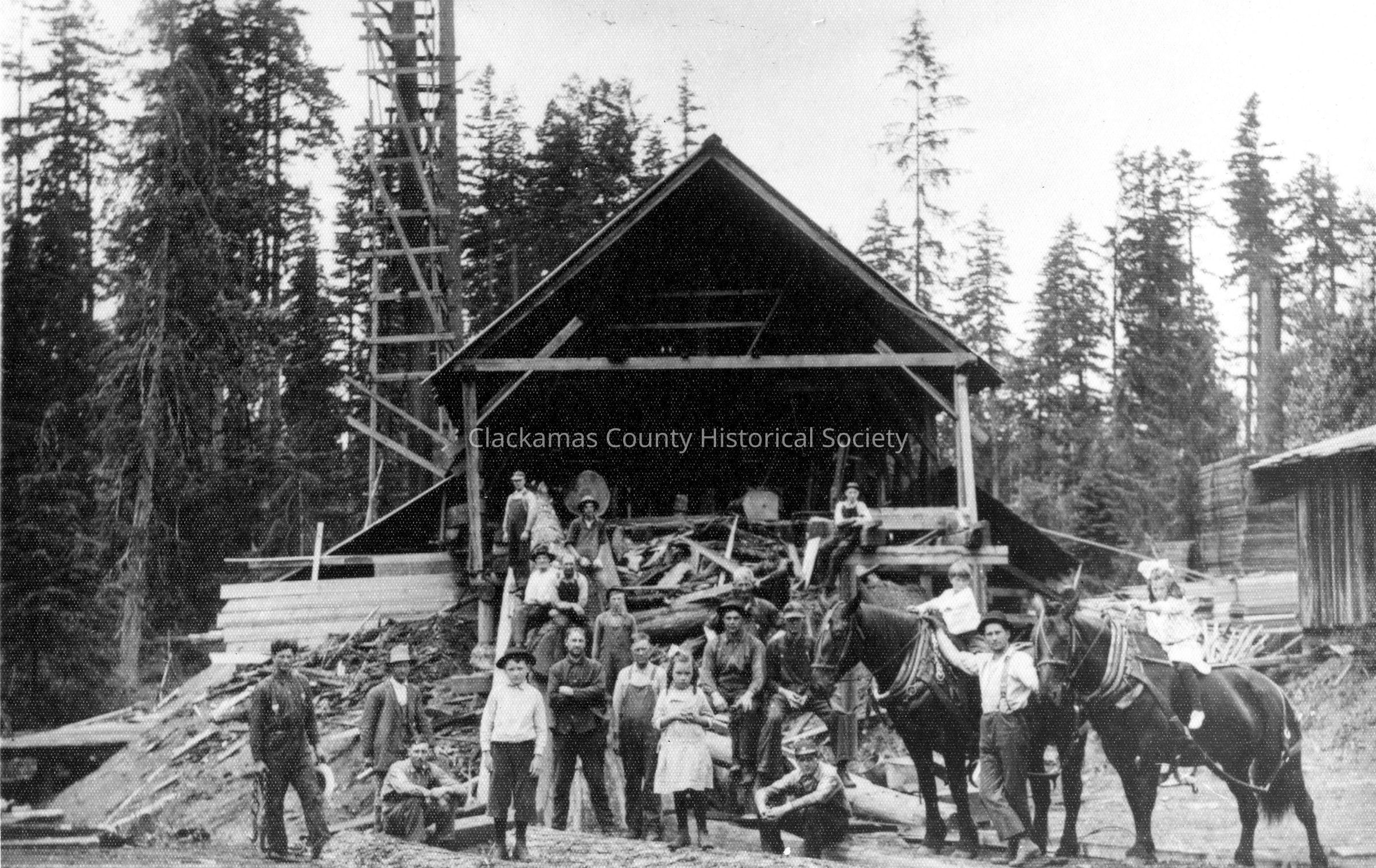 Nelson & jarl Sawmill, near Sandy, 1910. Logs, people, sawmill.Made/Created