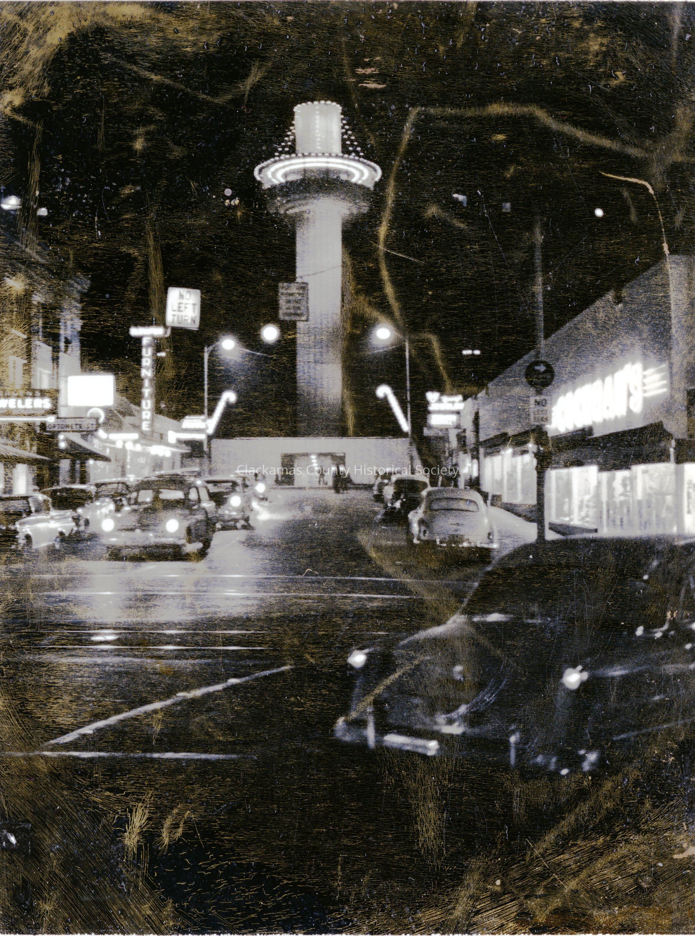 Night Photo of Oregon City Elevator with Christmas Decorations and Lights.Entry/Object ID