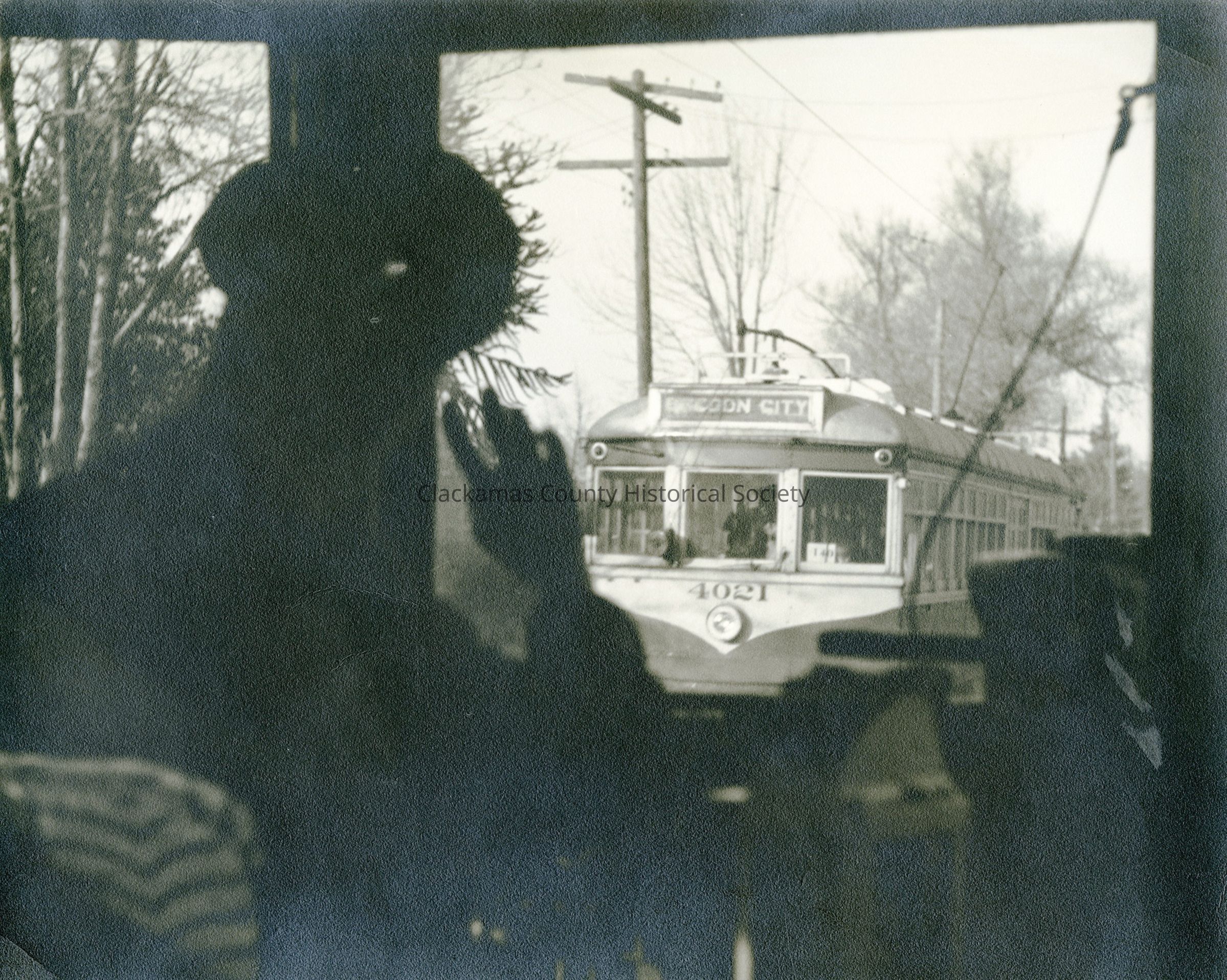 Interurban trolley #4021. Note on back: Station at Oak Grove siding. 1957?. View through front window of trolley. Includes driver. T-1400-003013