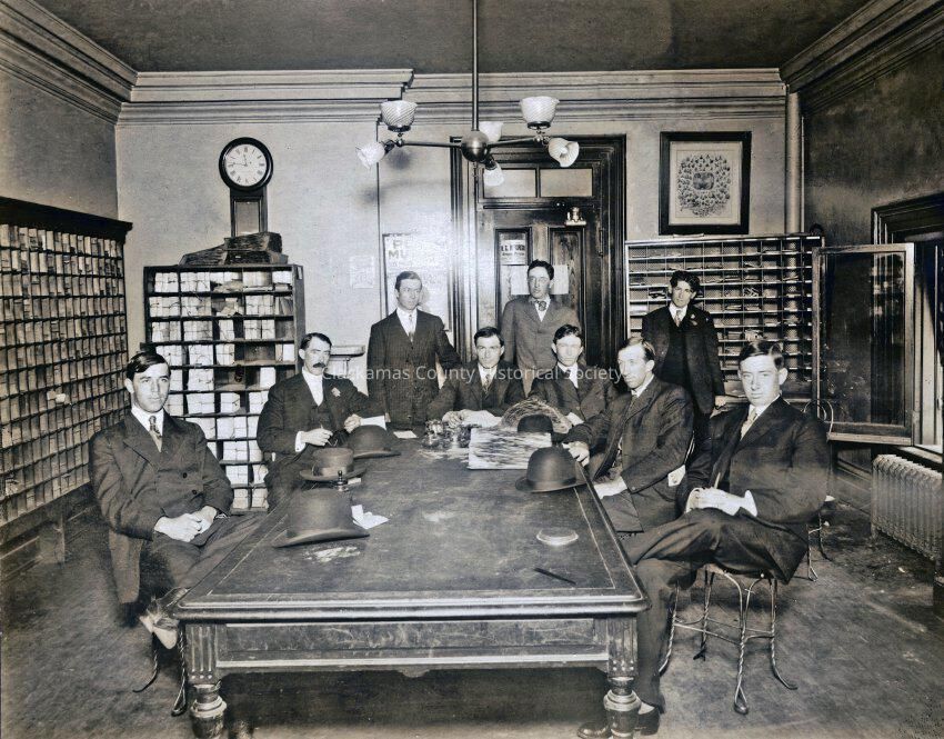 Interior of an office with 9 unidentified men sitting or standing around a table.. Clock and pictures on wall. 1900?.Made/Created