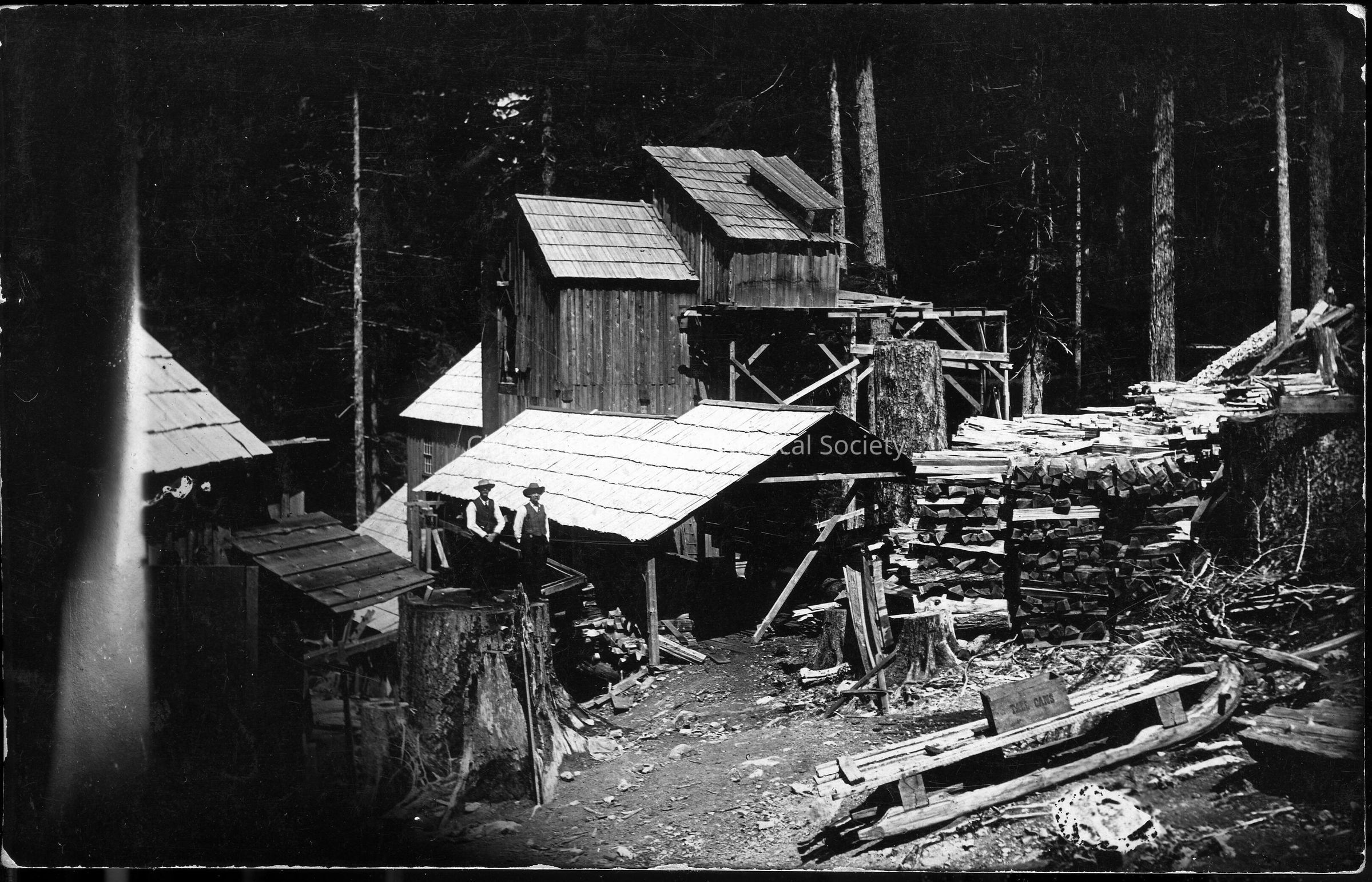 1907 The original Ogle Mountain Mill. Photograph Postcard showing Ogle Mountain Mine with 2 unidentified men on a stump. Oldest known mill of the ore mill and saw mill (as per Chris Daiker, Ogle Mountain Mine expert).Made/Created