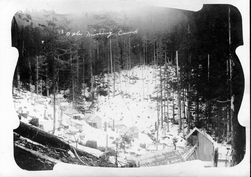 Ogle Mountain Mine camp in winter. Name of mine written in white on front of picture.