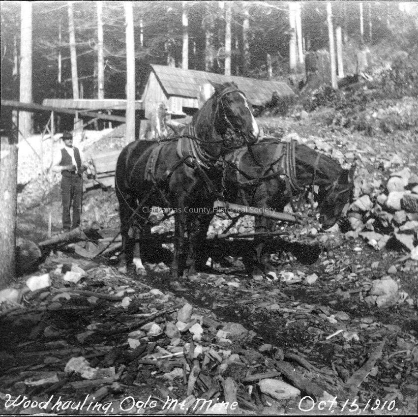 Photograph Postcard with "Wood hauling, Ogle Mountain. Mine Oct. 15, 1910." Two horses harnessed with man holding reins.Made/Created