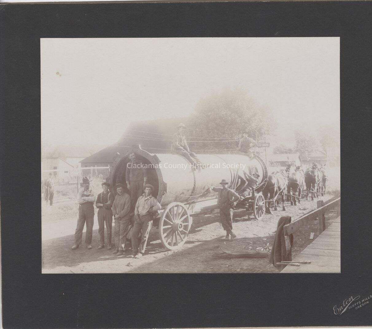 9 men standing and sitting around a large pipe, industrial grade trammel, on a wagonMade/Created