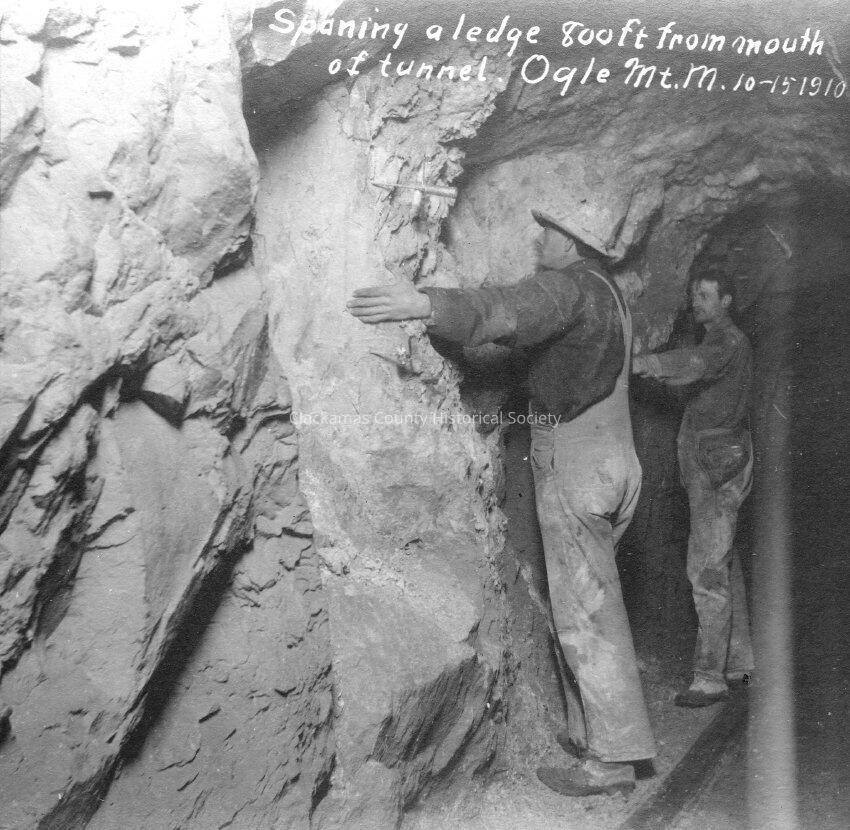 Photograph Postcard. Descriptions written in white on front. "Spanning a ledge 800 ft from mouth of tunnel. Ogle Mt. Mine. Shows 2 men on ledge with open arm span.Made/Created