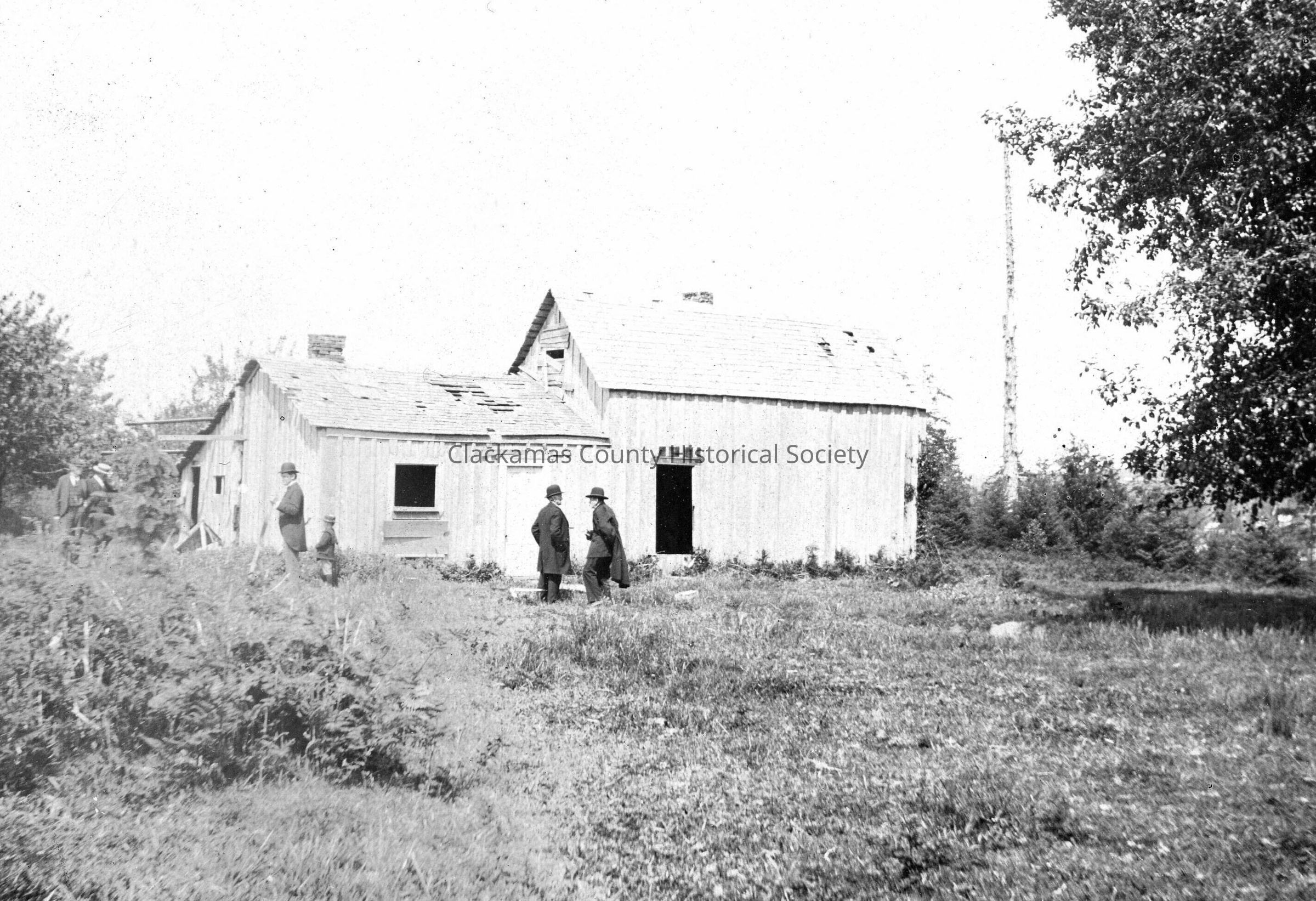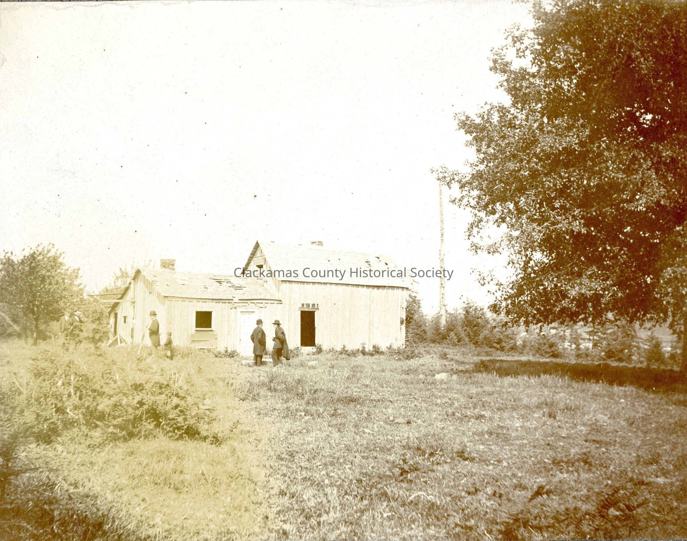 Old Fort Clatsop Site. House was built by W. Hampton Smith about 1870. The three fruit trees on the left were shipped from East via Cape Horn to Preston W. Gillette in 1852 and planted by Carlos W. Shane who then owned the site. These trees are healthy and still bear fine cherries and apples (in 1900). The old dead tree at right of the house is the last of the fine forest of spruce found on the site by Lewis and Clarke 100 years ago (now over 200 years ago).Made/Created
