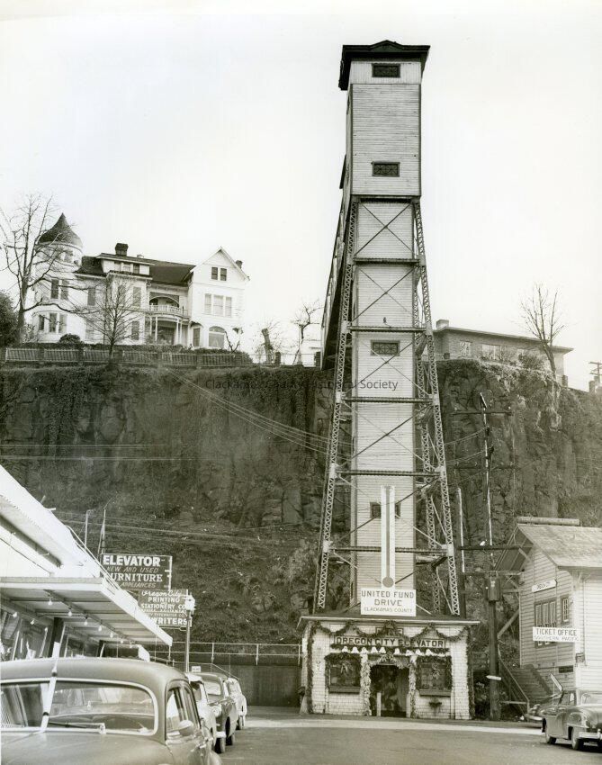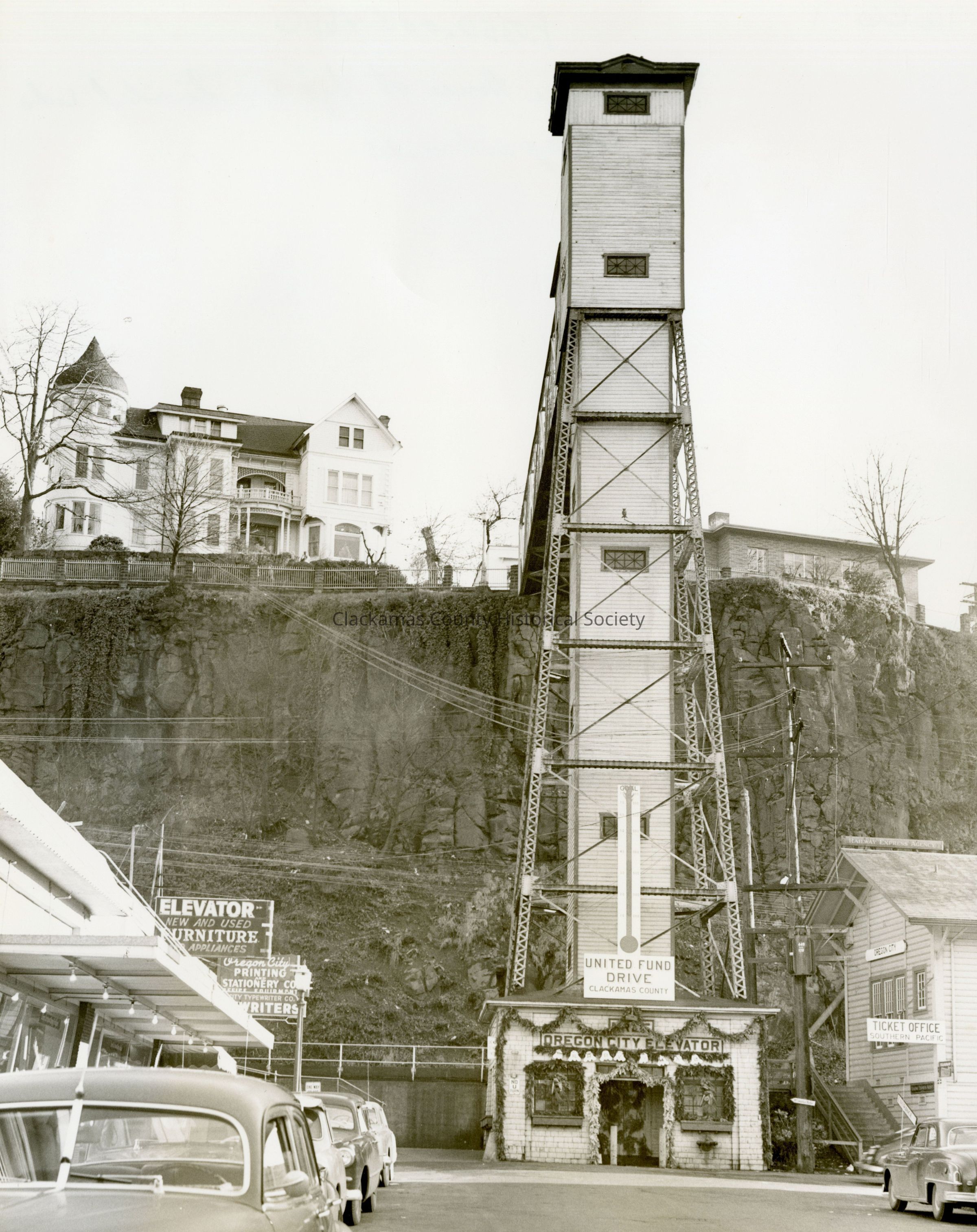 Oregon City elevator, Chase House, Elevator Furniture, Budget Loans. Oregon City Printing and Stationary Company. Unidentified people. On Back - Chase house Divided into 13 apartmentsMade/Created