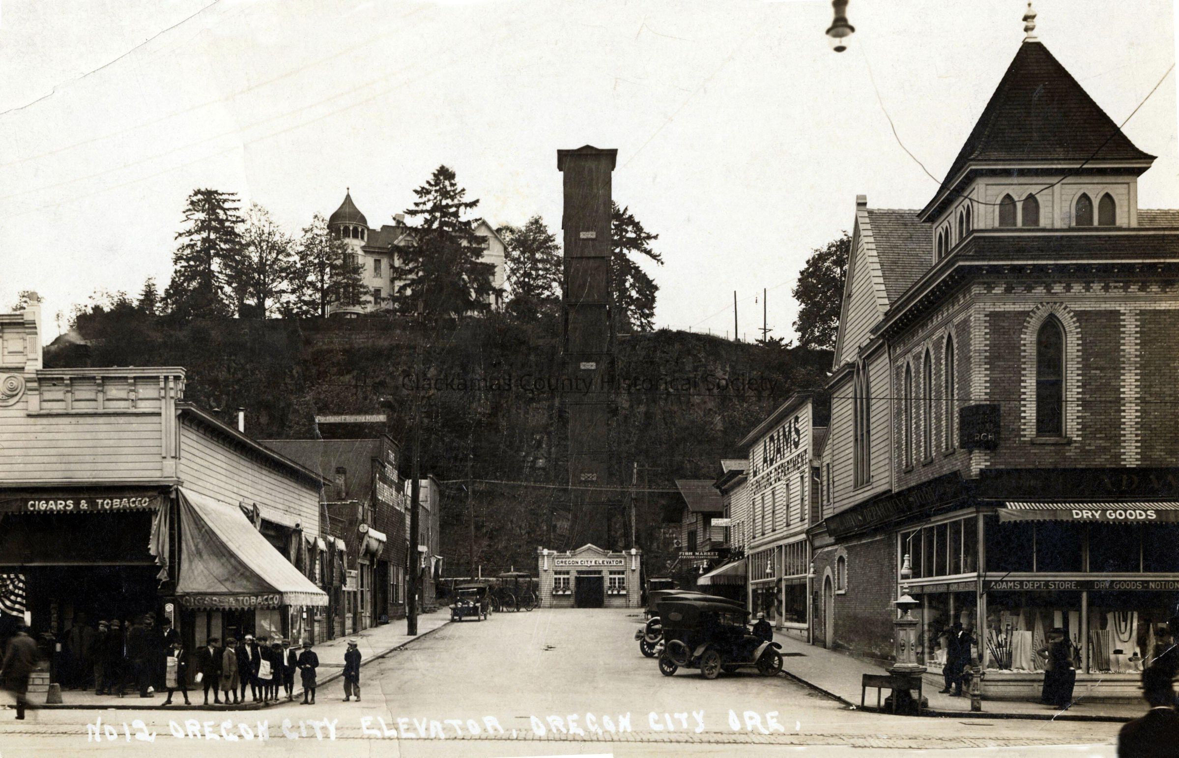 Oregon City elevator. Street scene. Postcard. Chase House. Old Methodist Church. The envelope contains two postcards with the same image, but each postcard has different writing on it. The older postcard was scanned.Made/Created