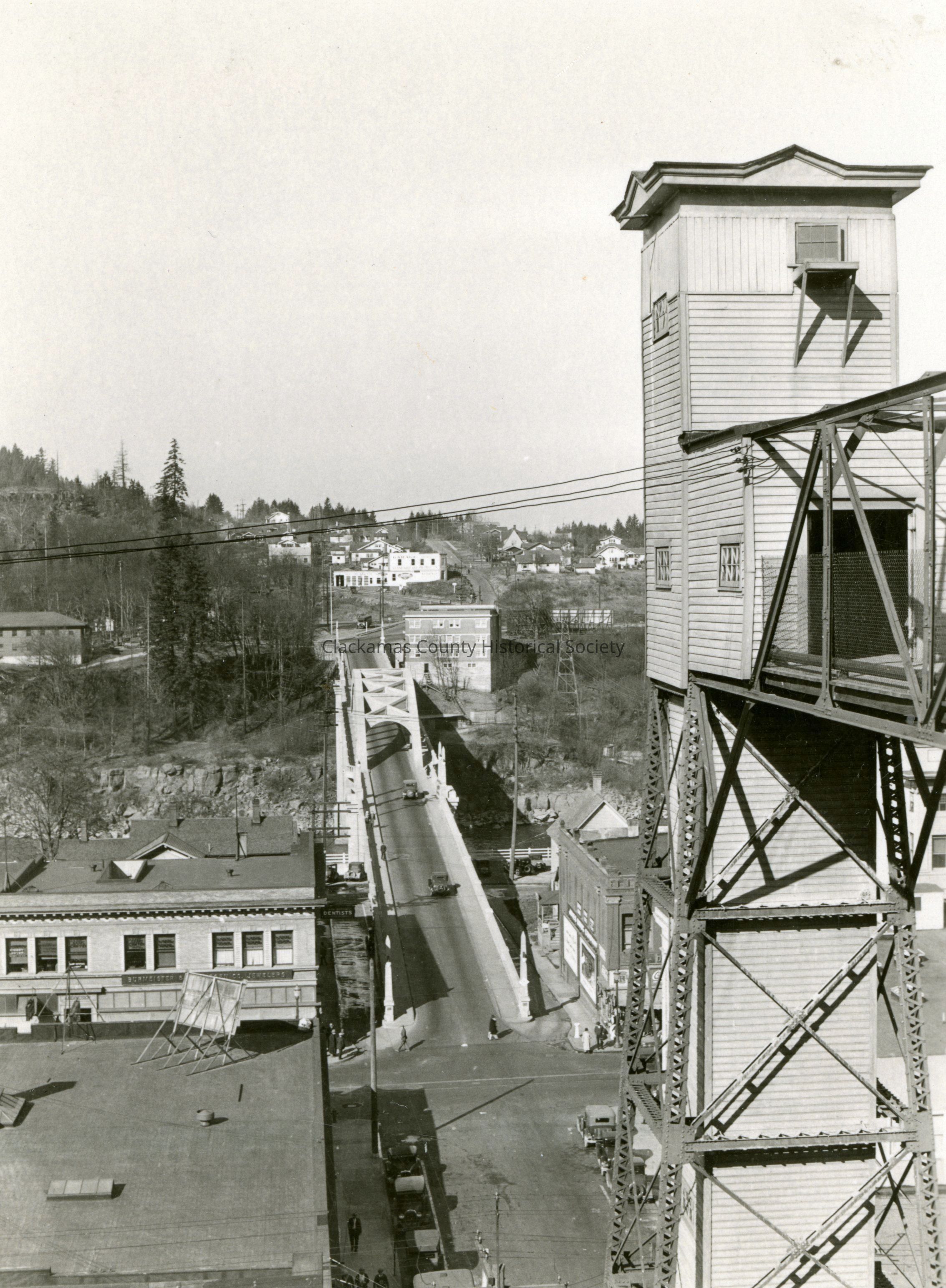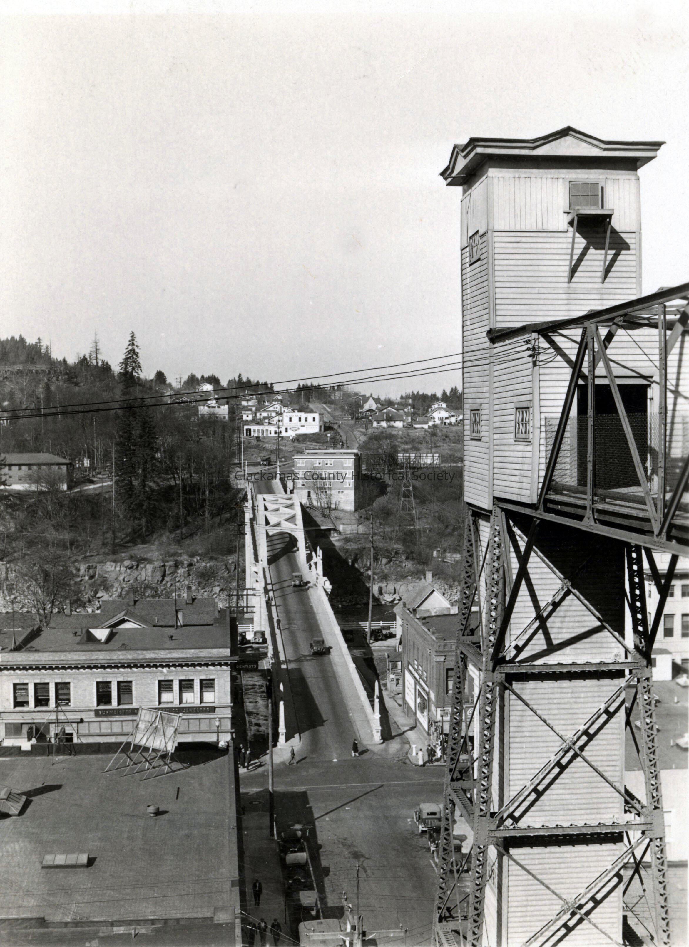 Oregon City elevator and street scene from top of elevator. 1926. Oregon City Bridge in background.Made/Created