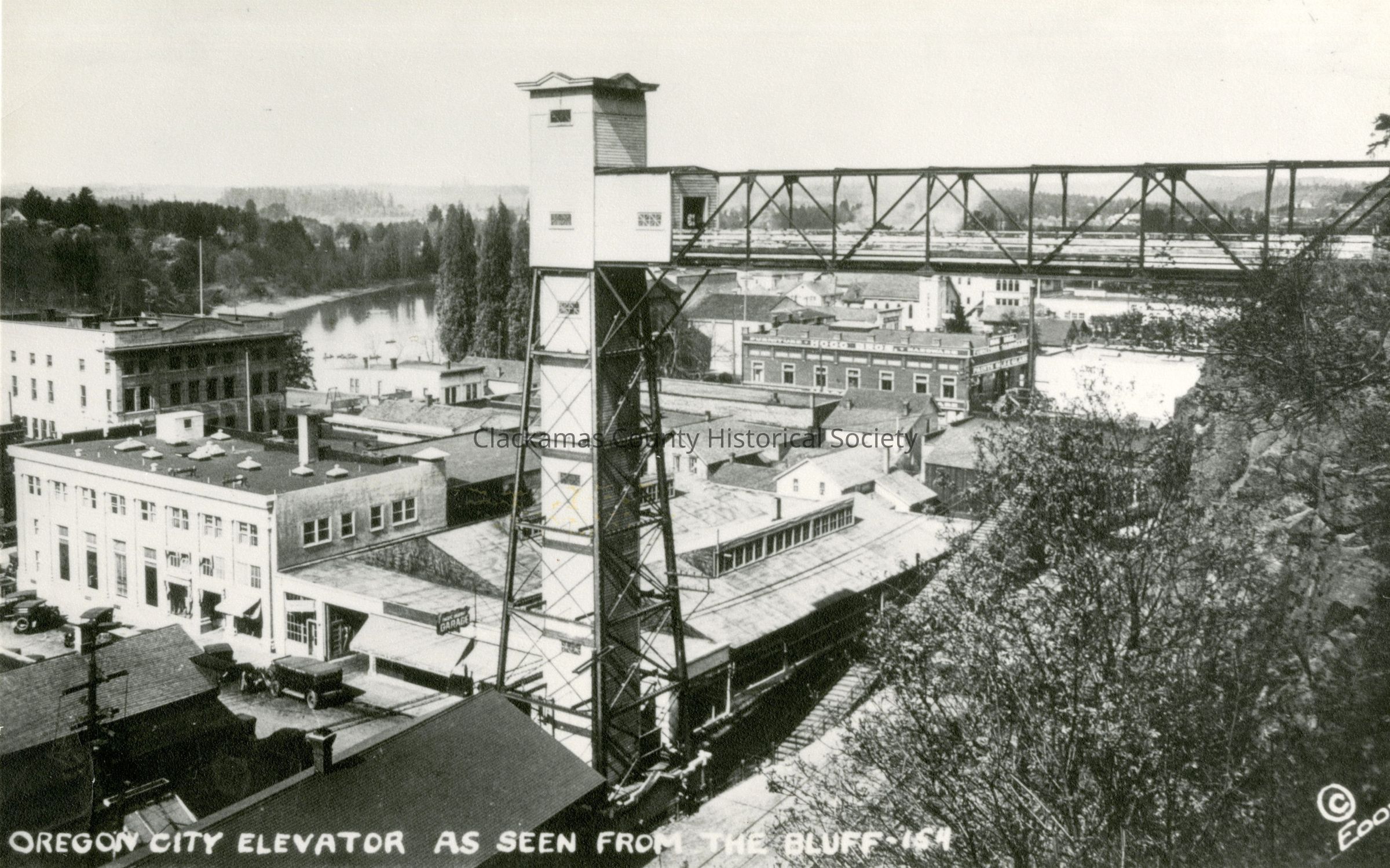 Oregon City elevator from the bluff viewing north. River in background. Buildings in Oregon City. This is an Eddy photo.Made/Created