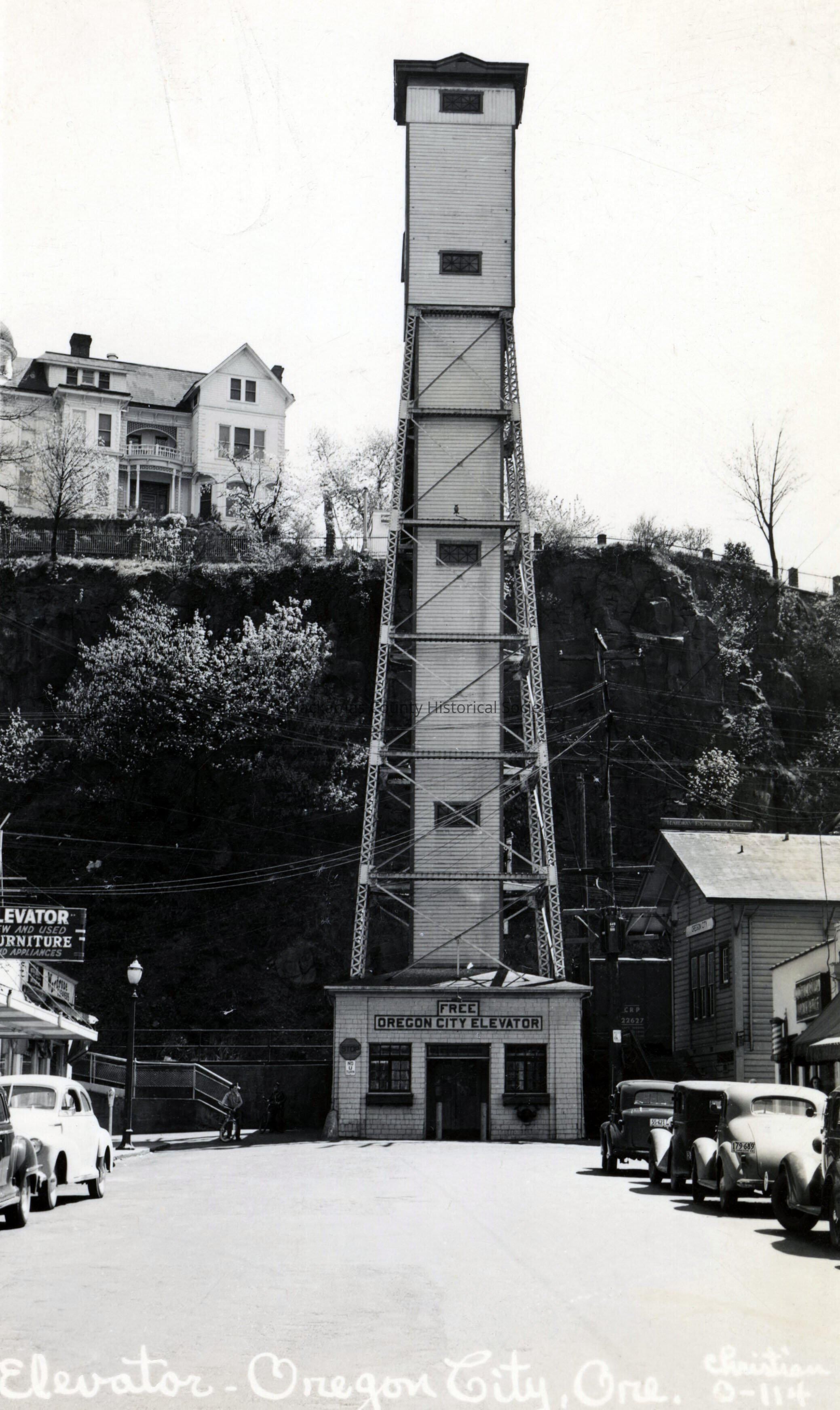 Oregon City elevator. Street scene. Post card. Chase House.