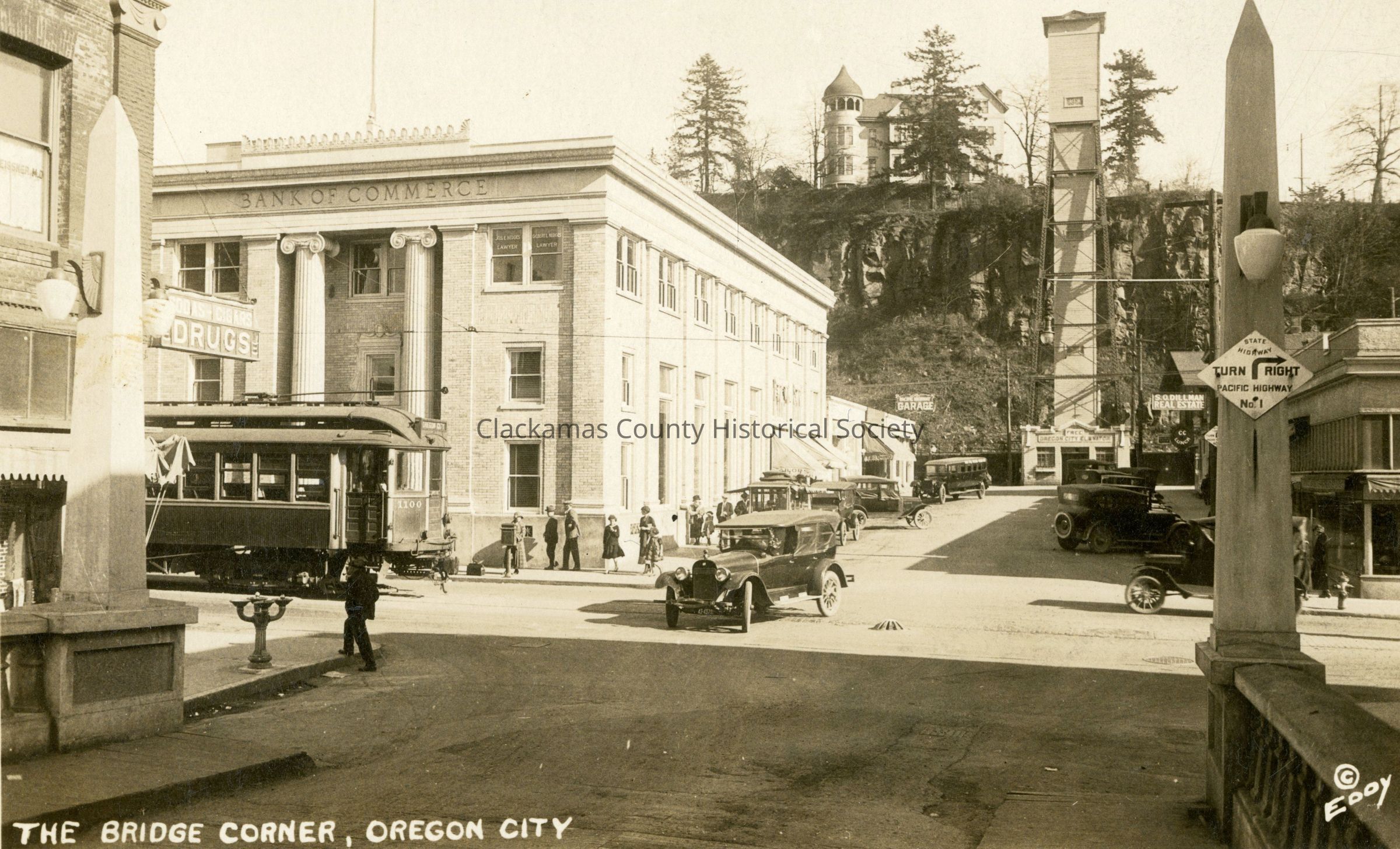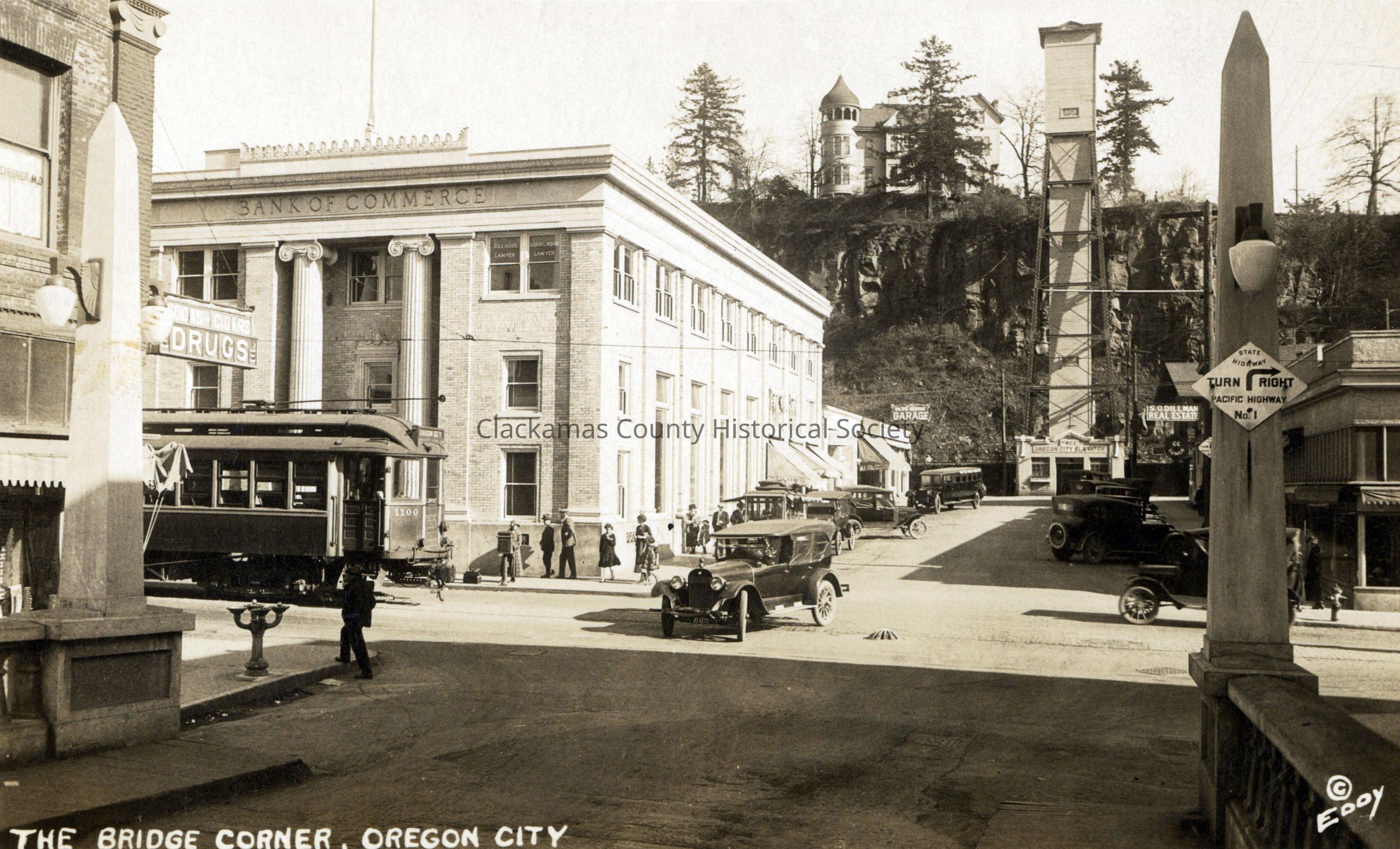 Oregon City elevator. Postcard. Street scene at 7th Street. Chase House in background.Made/Created
