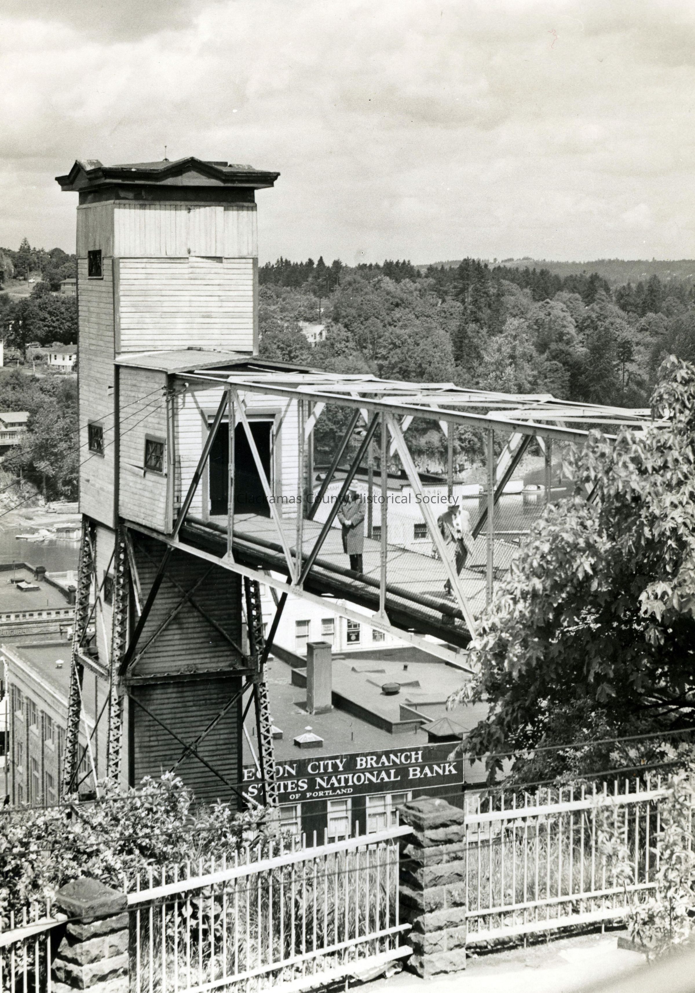 Prior to the new elevator construction . Old elevator, various views. of tower, train, arch bridge, 7th street, unidentified people. Oregon City Branch of United States National Bank of Portland. Series - P-1673, P-5623, P-5624, P-5625, P-5626, P-5627, P-5628, P-5629.Made/Created