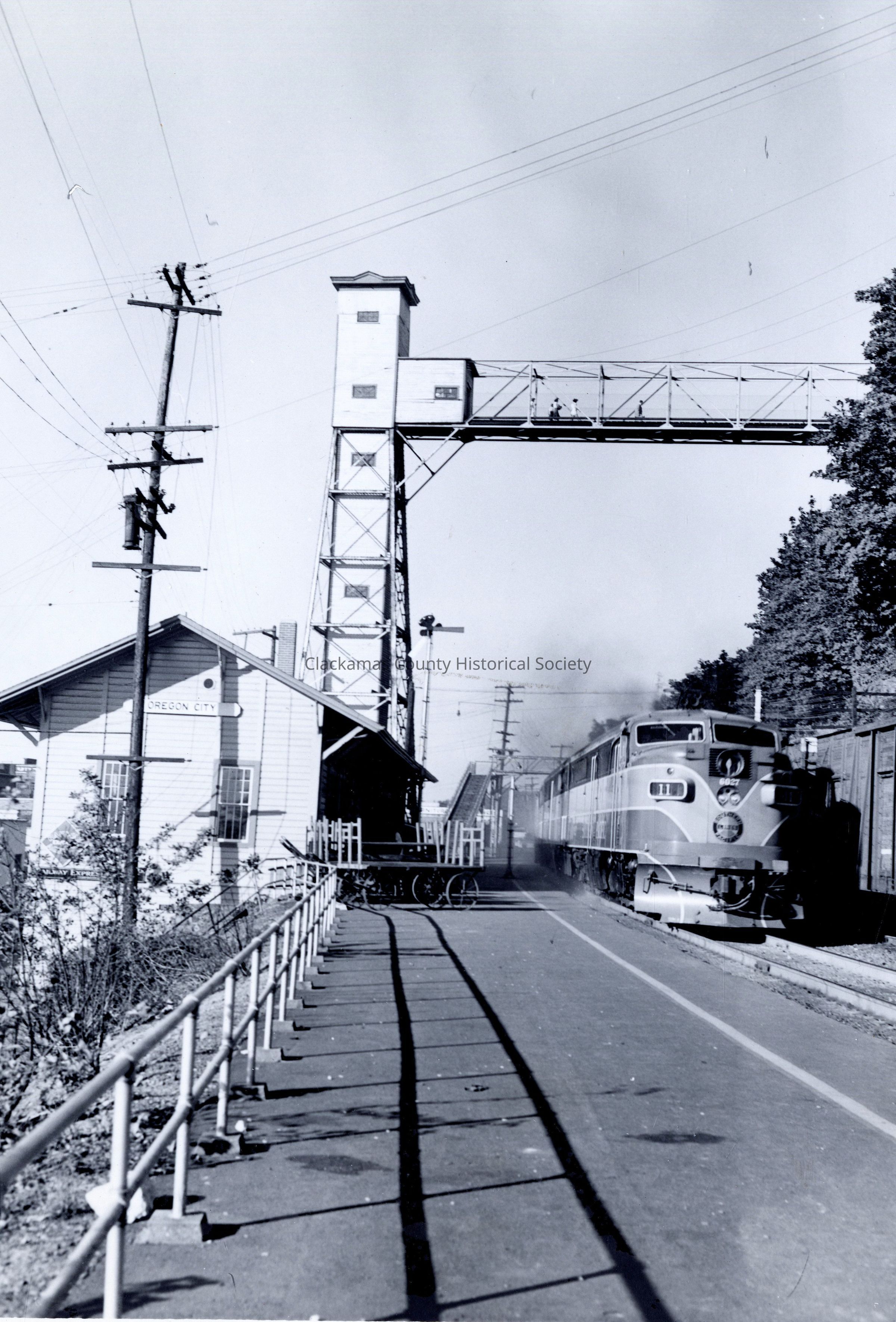Prior to the new elevator construction . Old elevator, various views. of tower, train and station, arch bridge, 7th street, unidentified people. Oregon City Branch of United States National Bank of Portland. Series - P-1673, P-5623, P-5624, P-5625, P-5626, P-5627, P-5628, P-5629.Made/Created