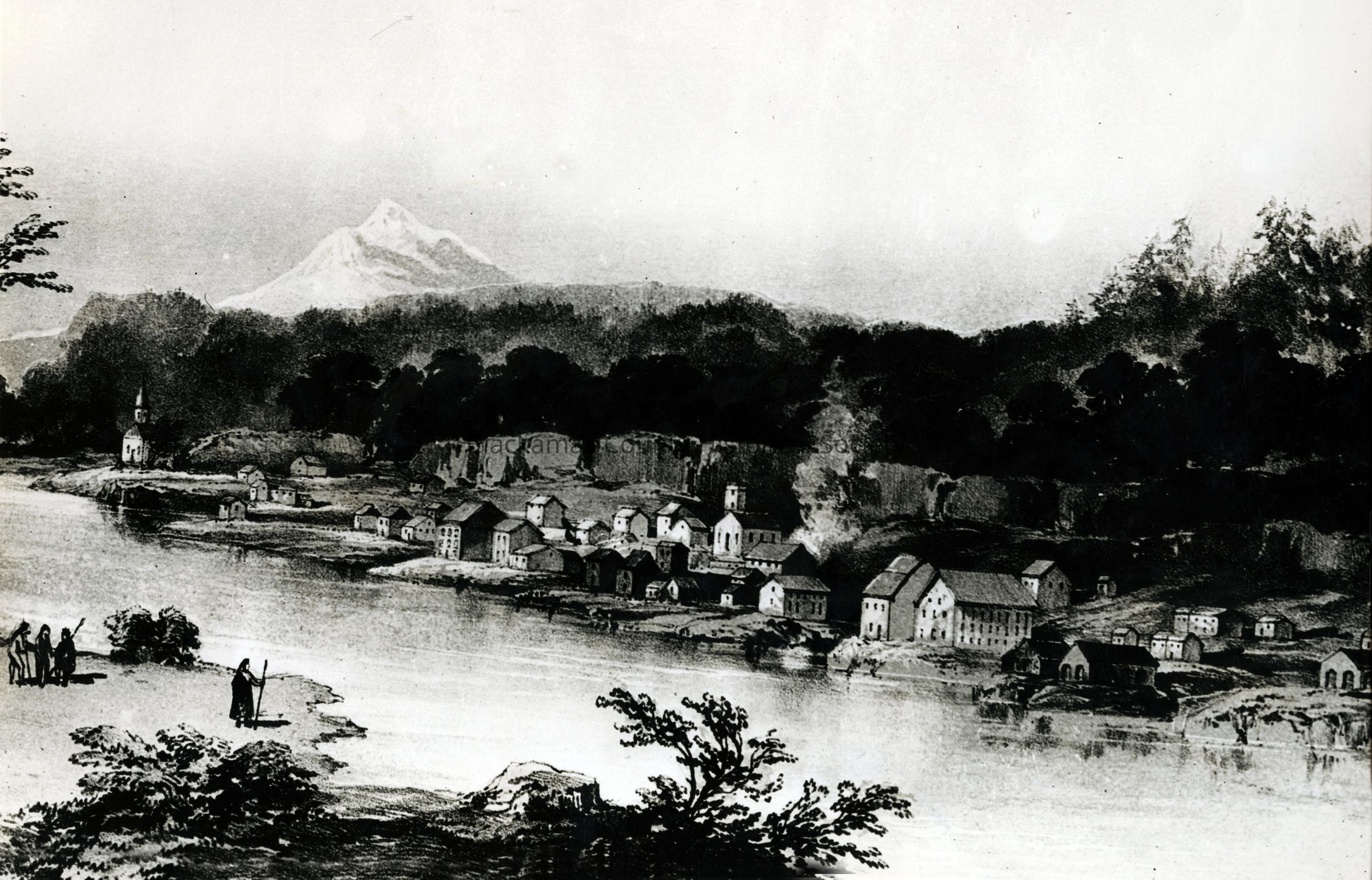A copy of a painting of Oregon City, Oregon by Sir Henry Warre done in 1846. The Library of Congress has original color painting.Made/Created