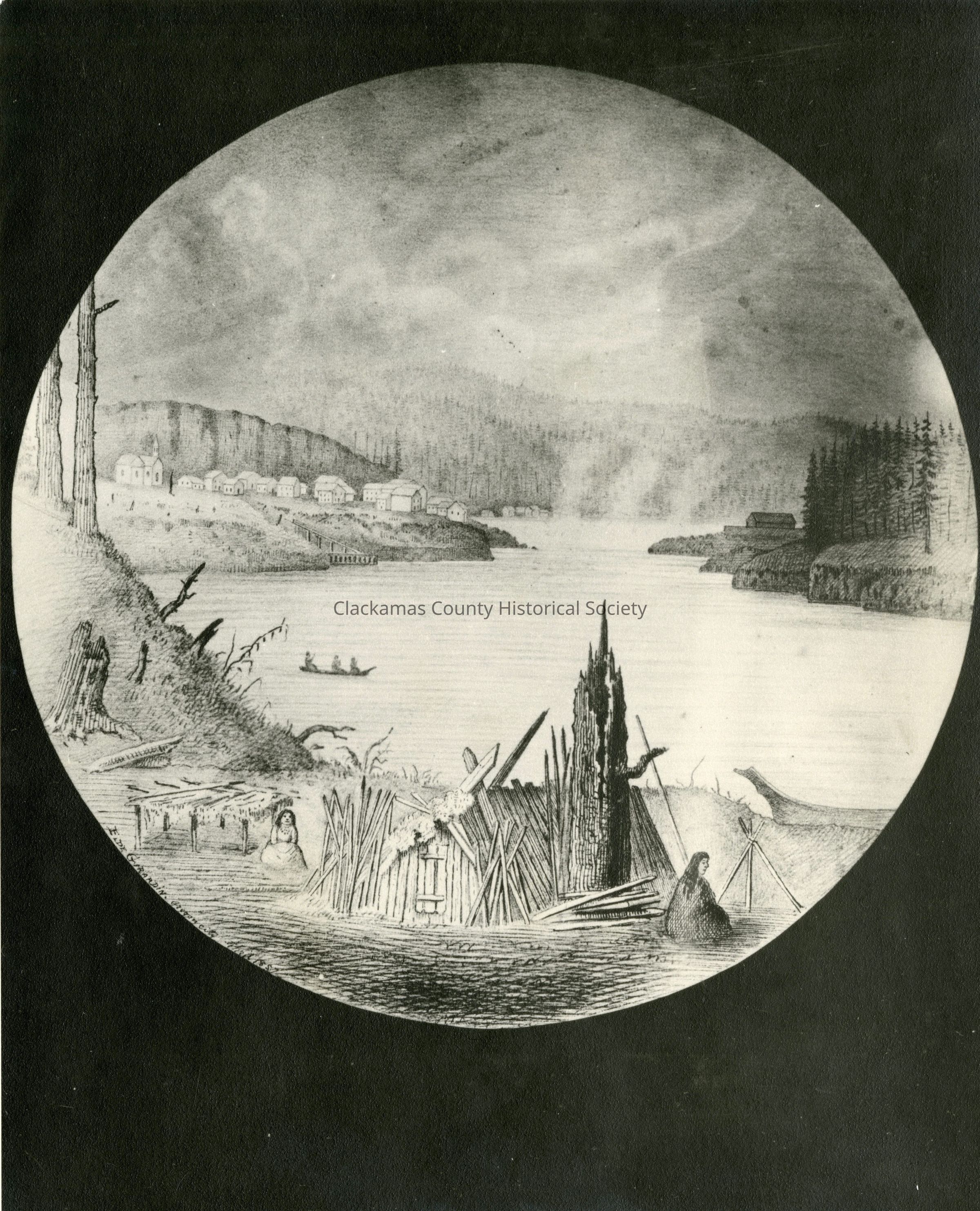 On the back of another photo hardcopy, the following is written: "Drawing of Oregon City from the mouth of Abernathy Creek, by E. De Girardin, 1857."