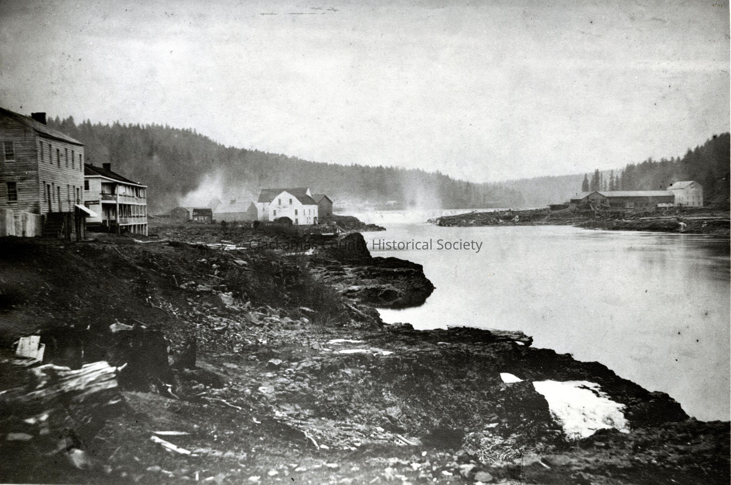Oregon City photo by Lorenzo Lorain. From L-R: Main Street House, Oregon Hotel, Pettygrove's Red Store, Oregon City Mills, and on the opposite side of the river is Robert Moore's Store.