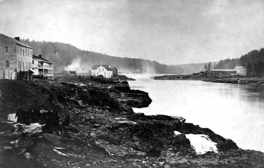 Oregon City photo by Lorenzo Lorain. From L-R: Main Street House, Oregon Hotel, Pettygrove's Red Store, Oregon City Mills, and on the opposite side of the river is Robert Moore's Store.