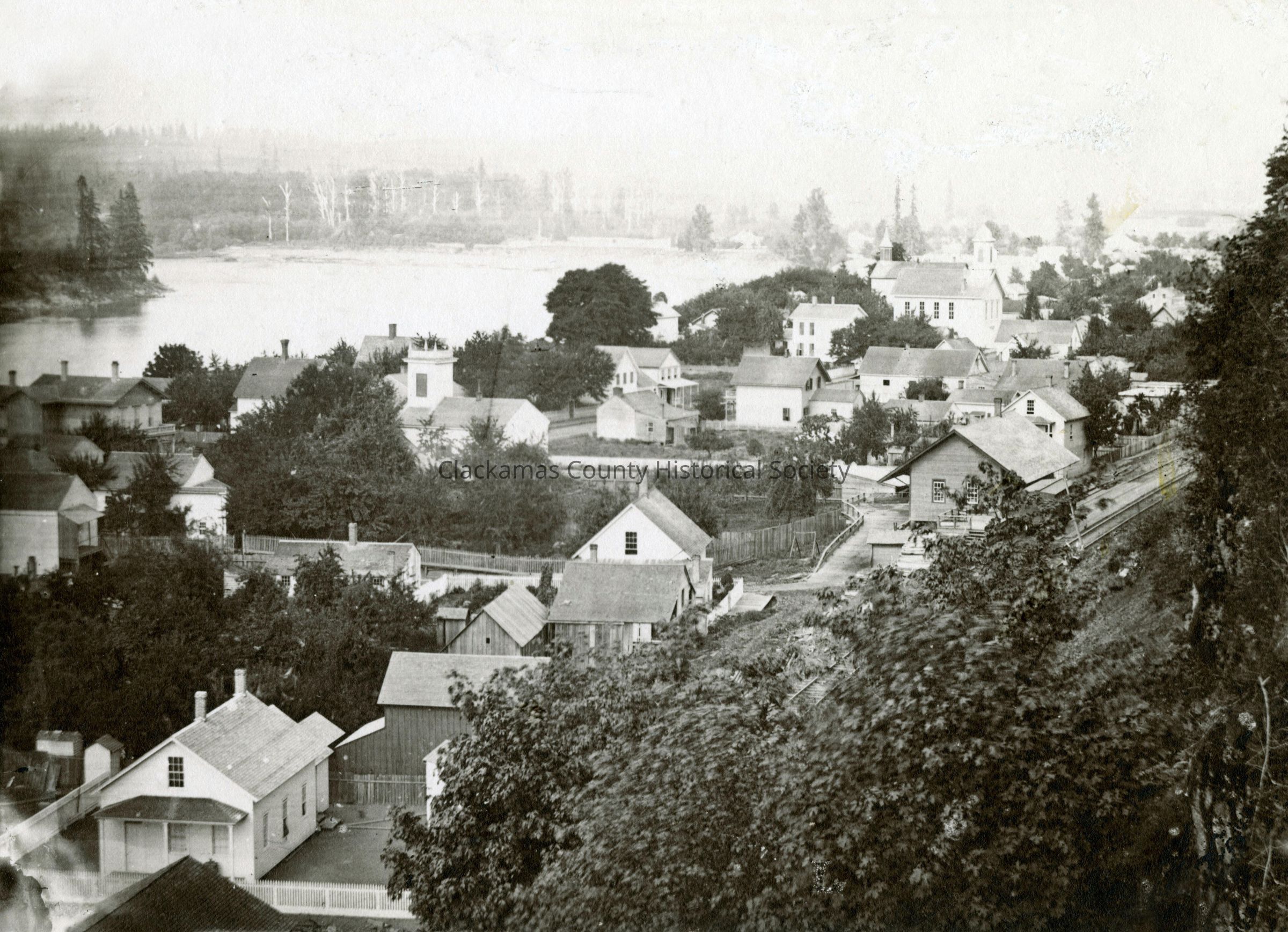 Oregon City Showing Southern Pacific Railroad Depot on far right. View from the Bluff above 6th Street.Made/Created