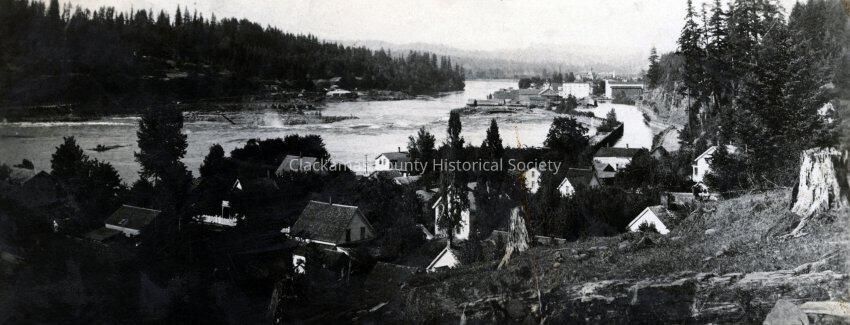 Looking Downriver from Canemah Bluff toward Oregon City. The courthouse tower is visible. The Suspension Bridge was not yet built.Made/Created