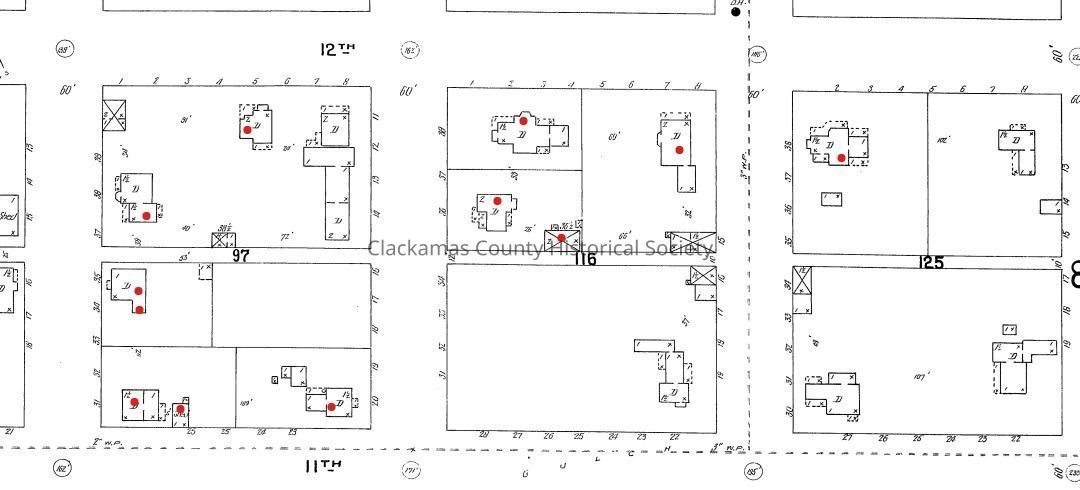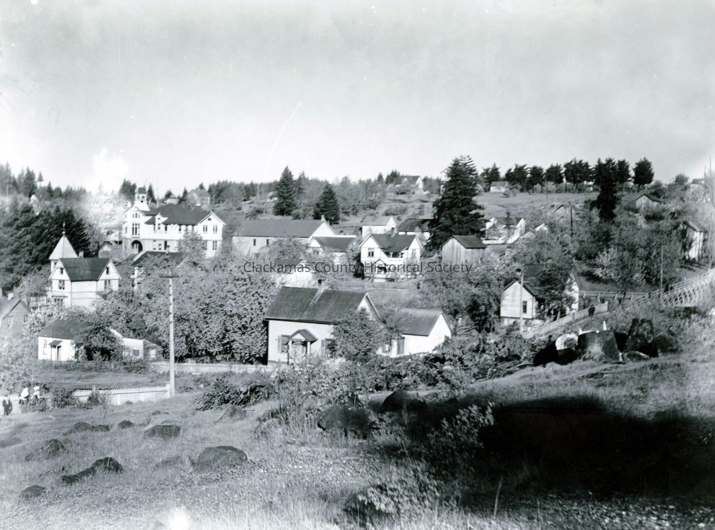 Oregon City, Looking East from11th and Washington Streets. Barclay School in distance. In the left of the photograph is the Barclay School & Gym, also known as the high school, and the Twelfth Street School, as it stood on the block at 12th and Madison. The house to the lower middle left, with the square tower (turret), is the Edward McLinn Howell House (still standing), although, by the time this photo was taken, he had already moved to Milwaukie, where he lived during the 1900 census (JAH 12/2022) The victorian to the right of center is the Anna Howell house at 1110 Jefferson Street. It is still standing, however the second floor balcony has been enclosed. (JAH 05/2023)Made/Created
