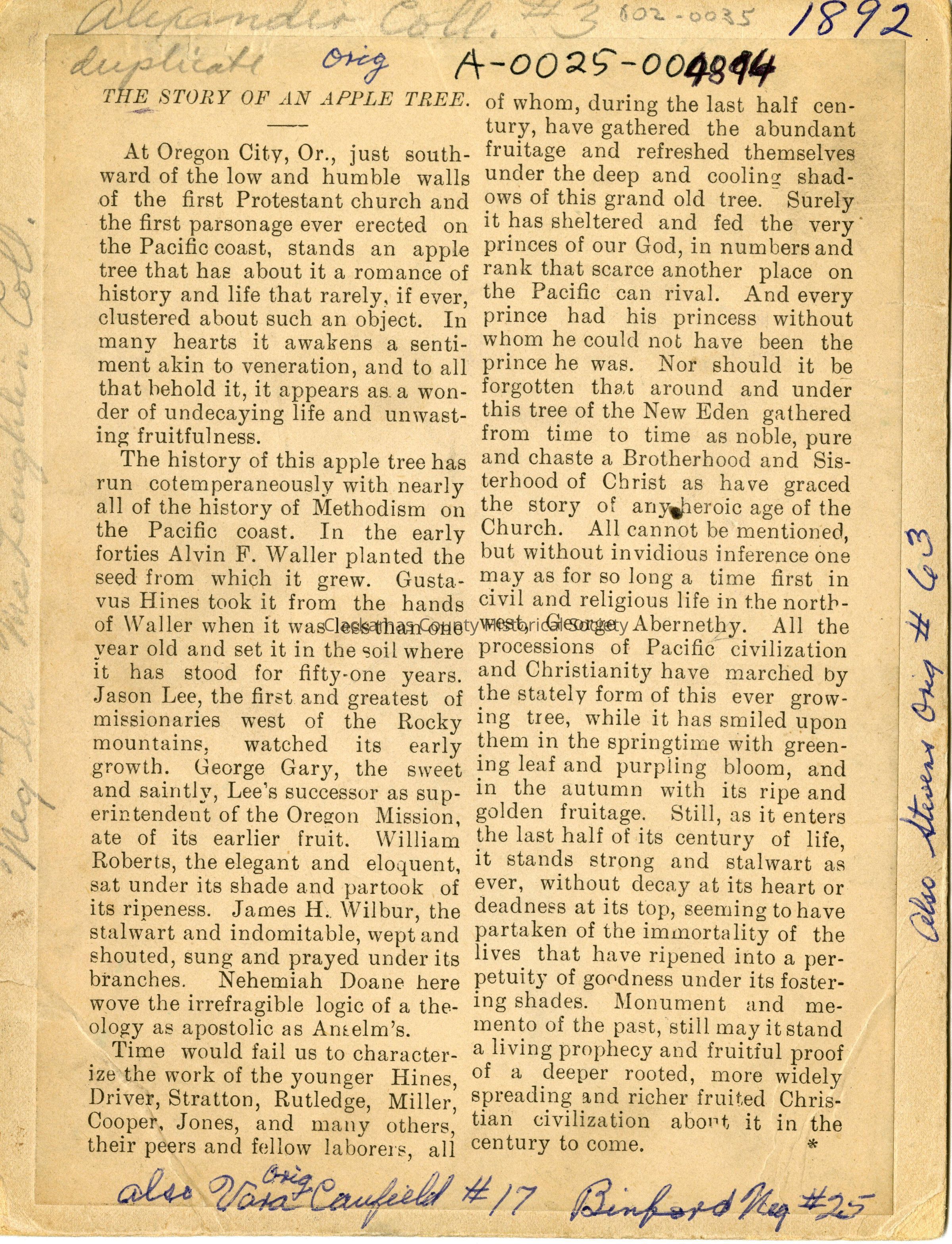 Oregon City 1892 - The Famous Apple Tree Story, (Methodist Apple Tree), 7th & MainEntry/Object ID