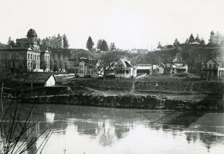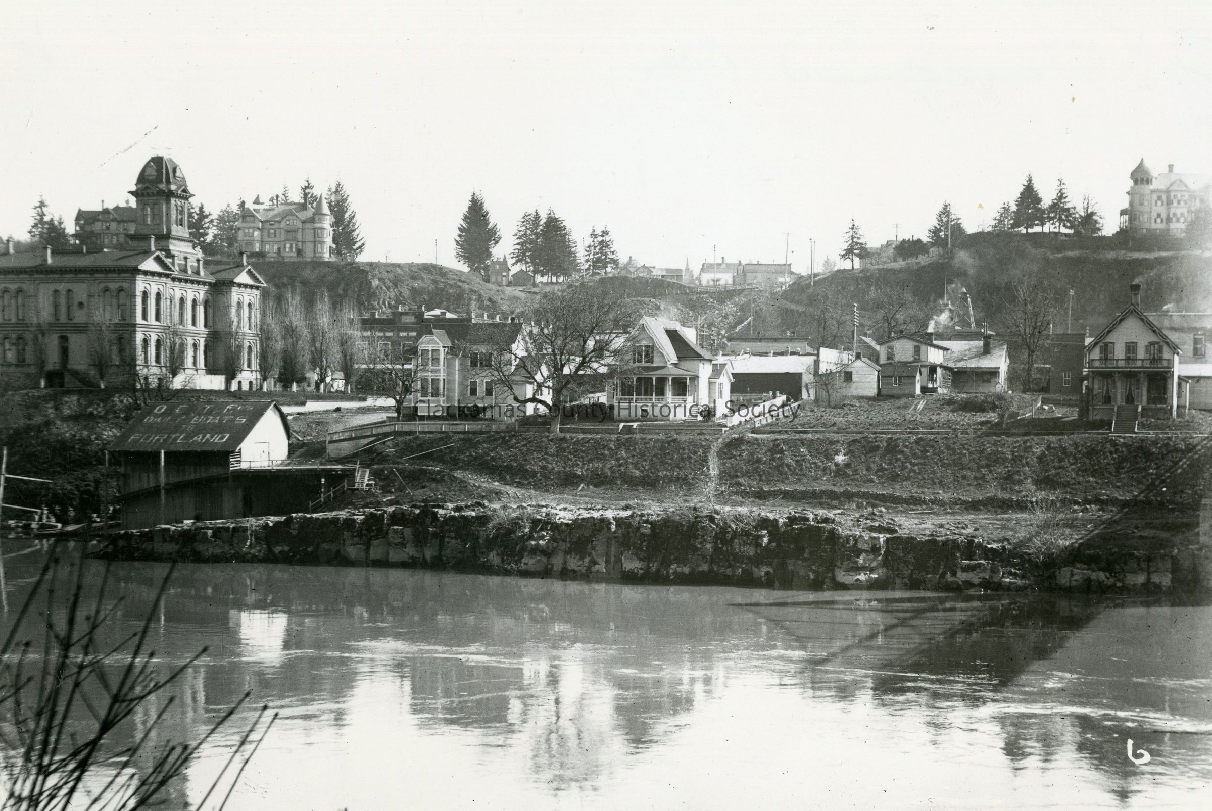 Oregon City from West Linn, 8th to 7th Streets. To the right of the courthouse on the bluff is the Eastham-Caufield-Morey Mansion. The house next to the Eastham-Caufield-Morey house is the Walden/Mount house. The house on the far right on the bluff is the Chase House. The river-level house on the far right was Dr. Carll's house and office. Dr. Carll's house, perhaps owned by the Barclays' given the confusion that the Barclay house was turned and moved toward the river to make way for the Barclay building. See Image P-1857 (JAH 12/22) The 8th Street dock is on the left under the courthouse.Made/Created