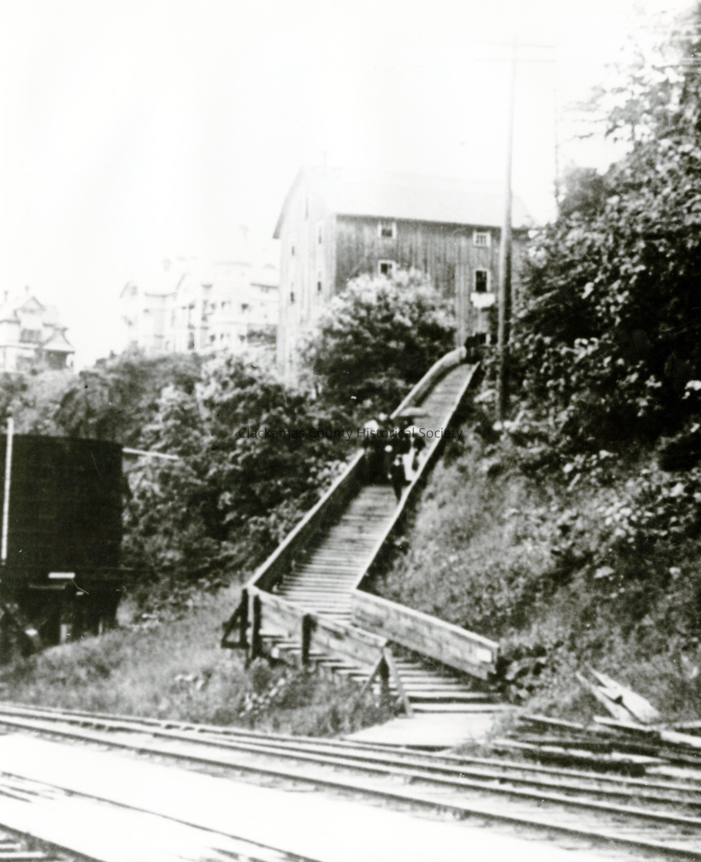 7th Street Steps in Oregon City. (Blurry photo enlargement.) Singer Hill Mill at top of stairs.