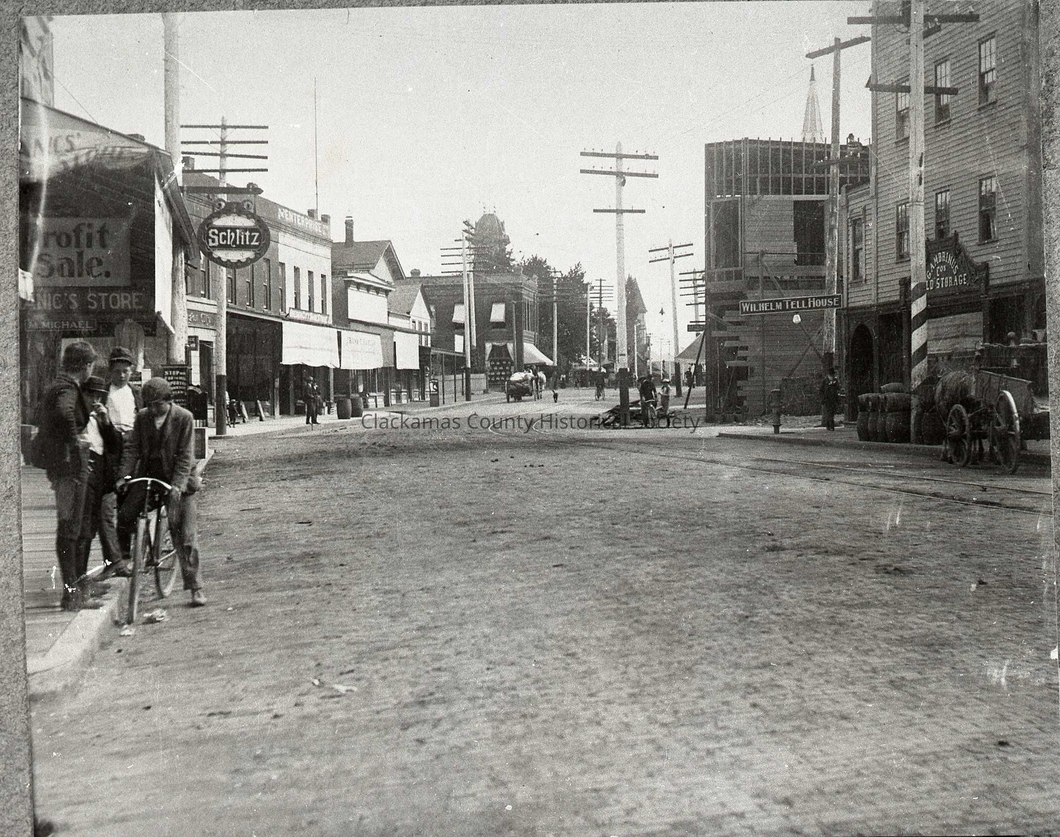 Oregon City Main Street, looking NE toward 6th Street. Stevens corner on the upper left, the Oriental Hotel called the Wilhelm Tell House, and Gambrinus Cold Storage (JAH 11/2022)Made/Created