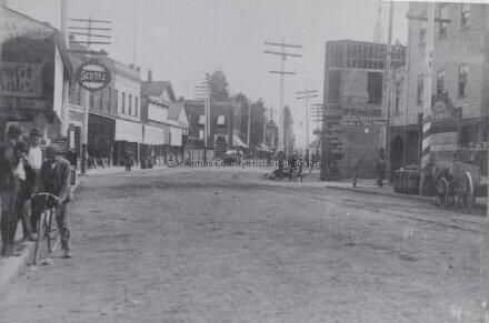 Oregon City at Main Street looking Northeast toward Sixth Street c. 1896. Stevens building on Northeast Corner of Sixth Street is under construction.