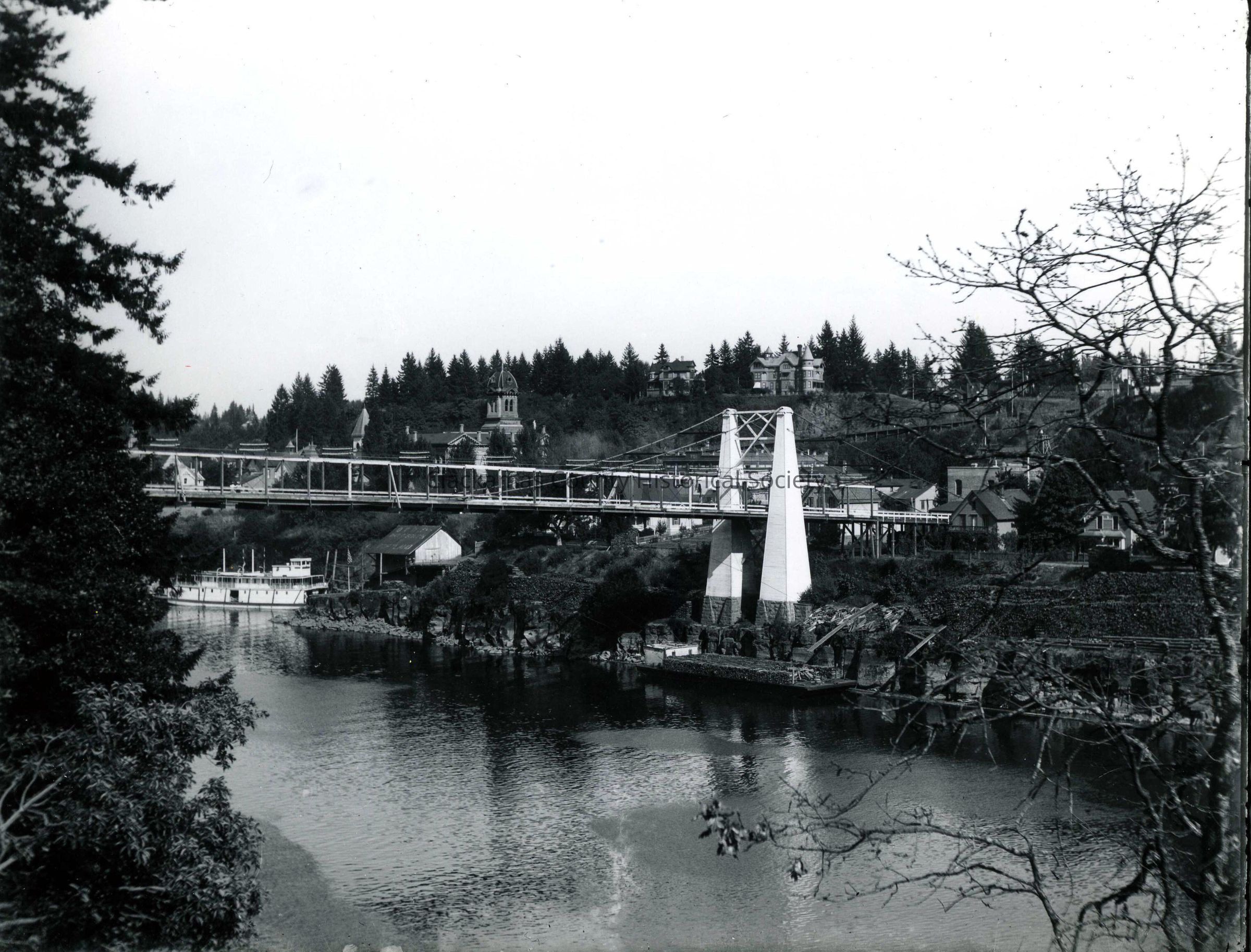 Suspension Bridge at Oregon City-West Linn over Willamette River. 8th Street Dock, Courthouse, and Steamer are also shown in the photo. Photo taken from the West Linn side.Made/Created