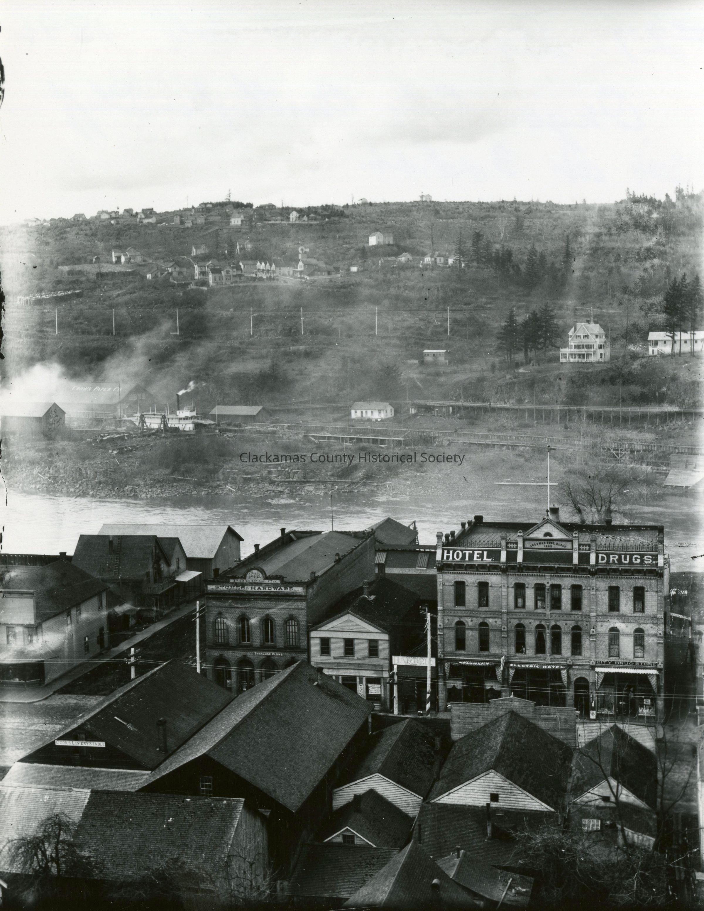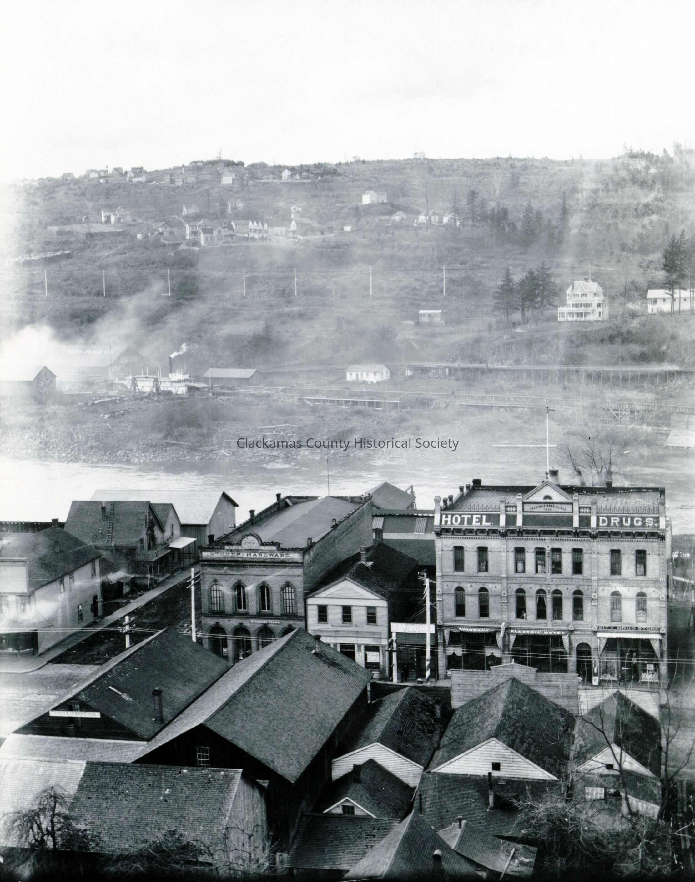 Oregon City from the Bluff at 4th Street, 1896. Electric Hotel, City Drug Store, Pope's Hardware.Made/Created
