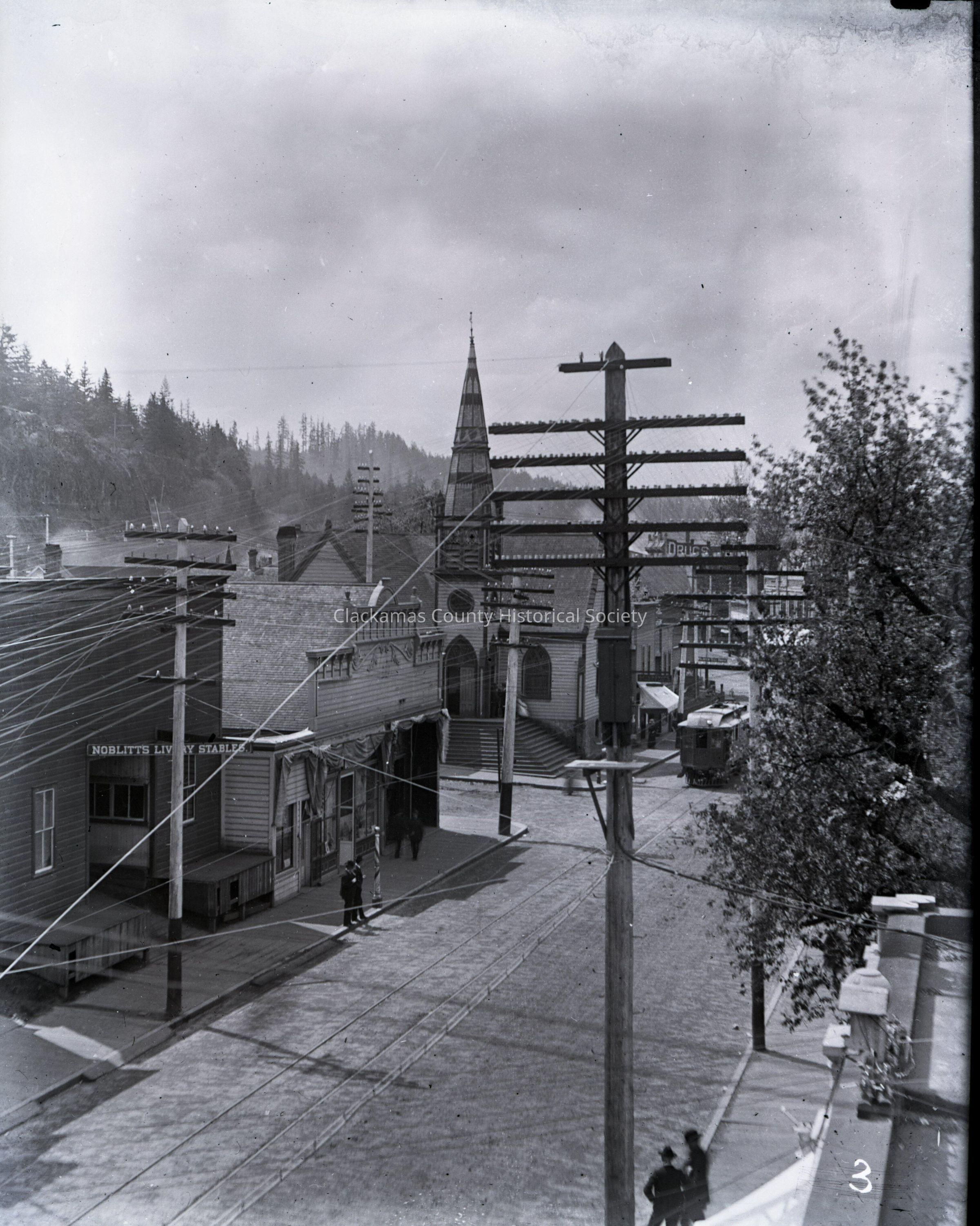 Oregon City, Main Street looking south between 7th and 8th. Shows Noblitts Livery Stables. Glass negative in envelope with photograph attached.