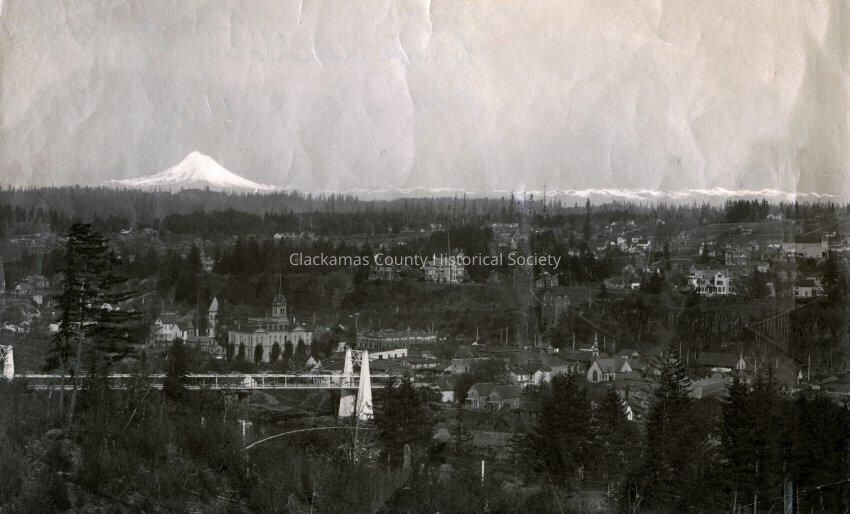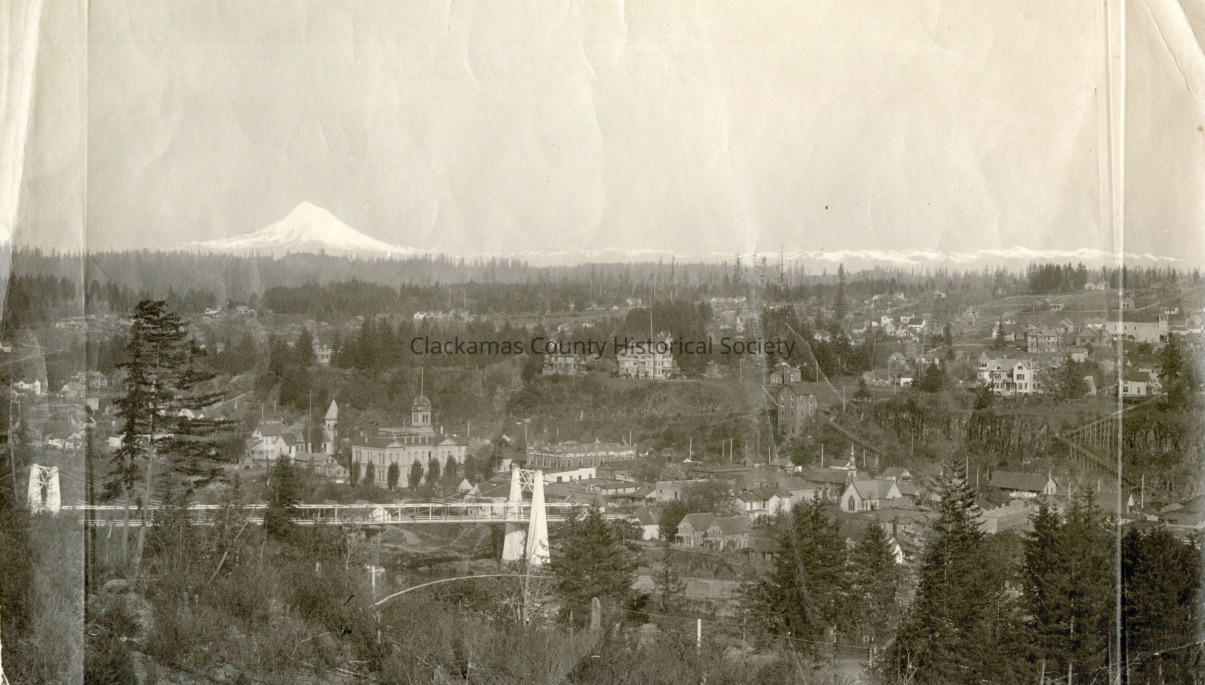 Oregon City from West Linn. Mt. Hood in distance. Shively's Theater far right middle. Charman house, now Holman and Hankin, is on the right, middle.Made/Created