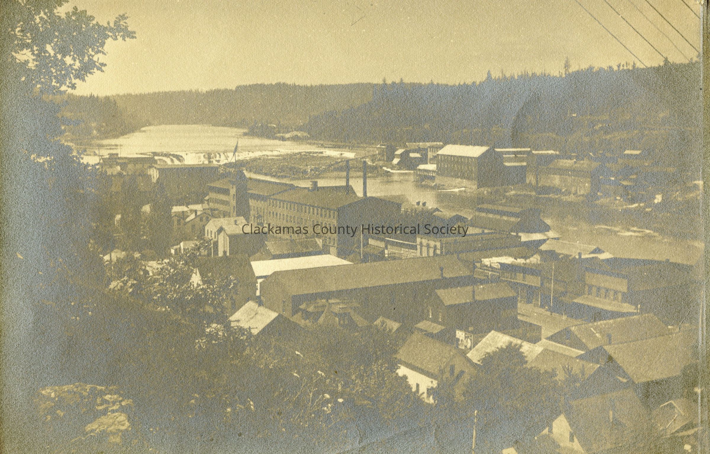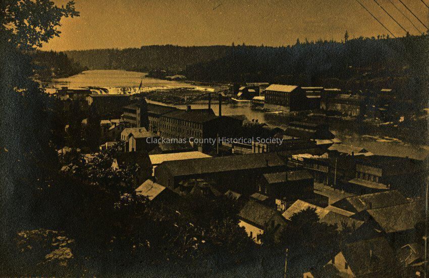 Oregon City from the Bluff, 4th and Main Streets To Willamette Falls. Mills on both sides of the river.Made/Created