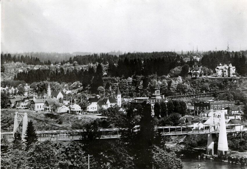 Oregon City from West Linn. On north corner of 10th & Water Streets is the Sullivan House. To the right of the Sullivan House (coming South) is St. John's Catholic Church, the Priest's house and then the Sisters' House.Made/Created