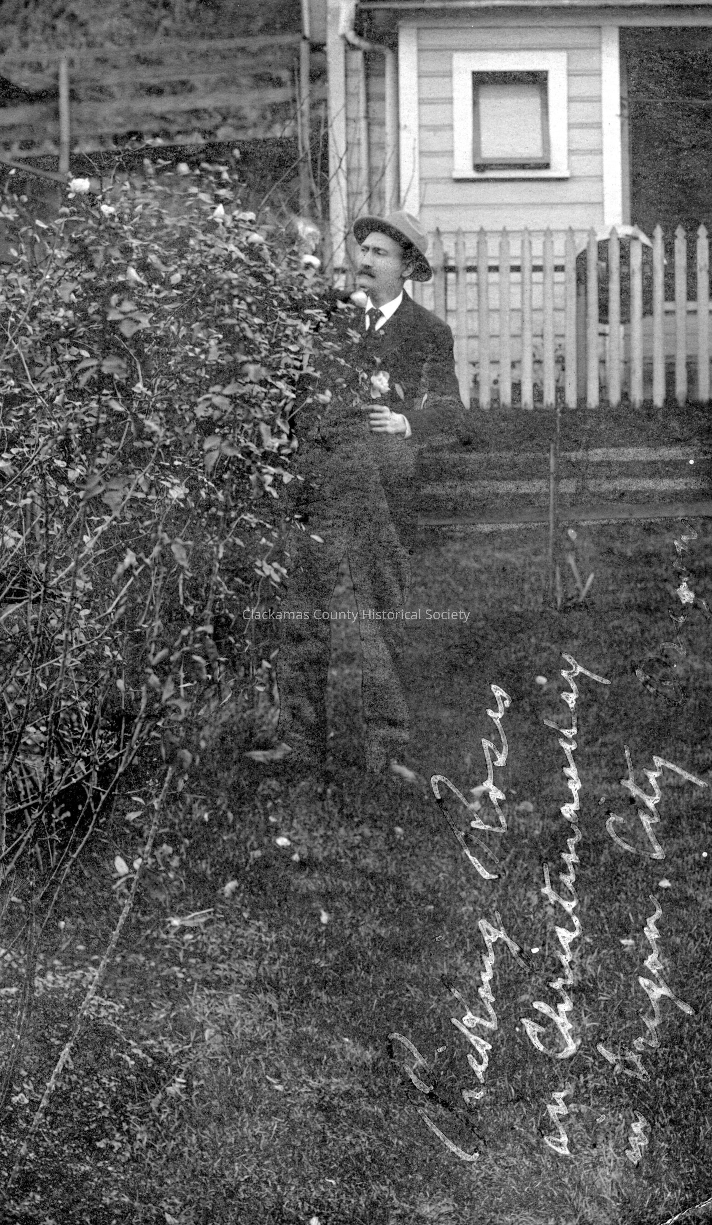 Al Knapp, Oregon City Councilman, 1904-1909. Picking Roses on Christmas Day, 1907. Note Singer Hill Walkway in the background.Made/Created