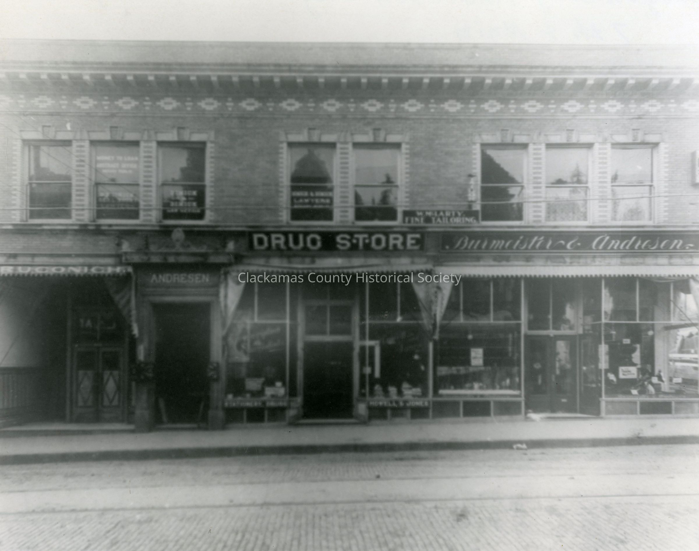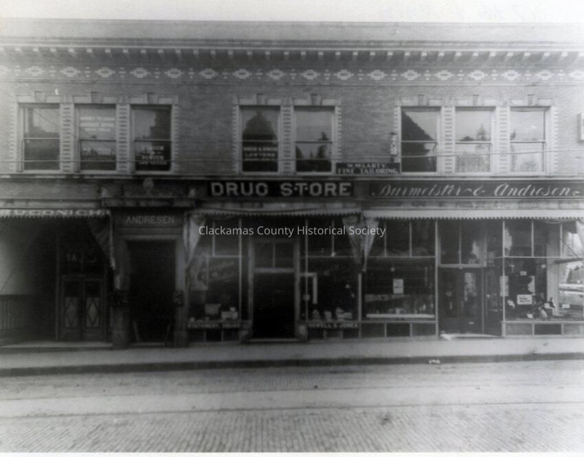 Oregon City Andresen Building. September 8, 1908. 7th and Main Street. Howell & Jones Drug Store. Ruconich store.Made/Created