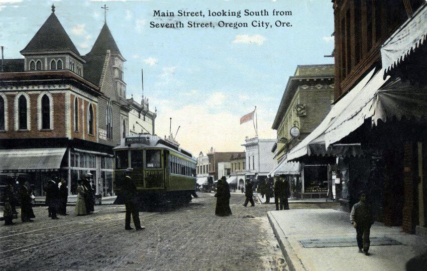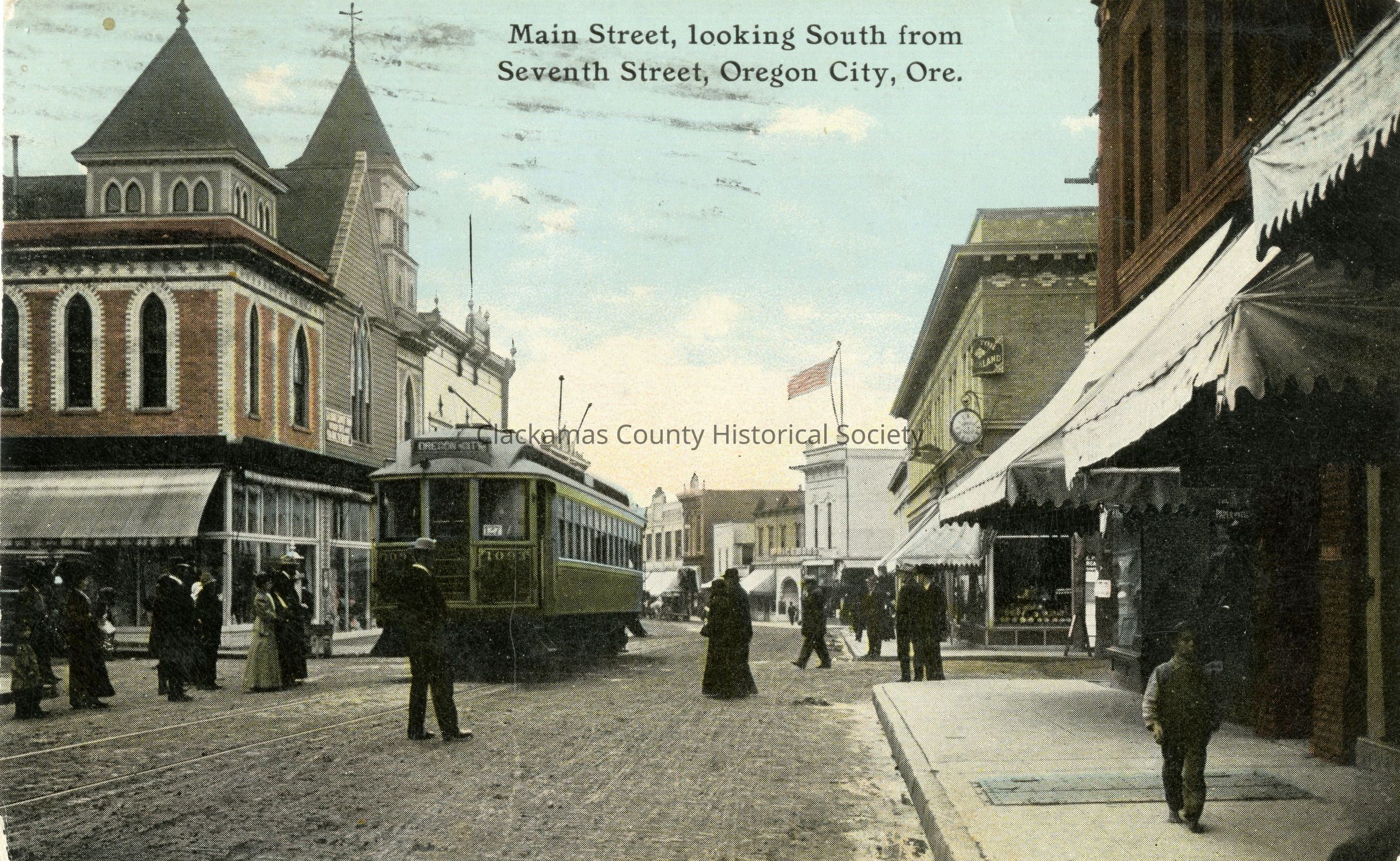 Oregon City Main Street, Looking South from 7th Street. Methodist church to the left of the streetcar.Made/Created