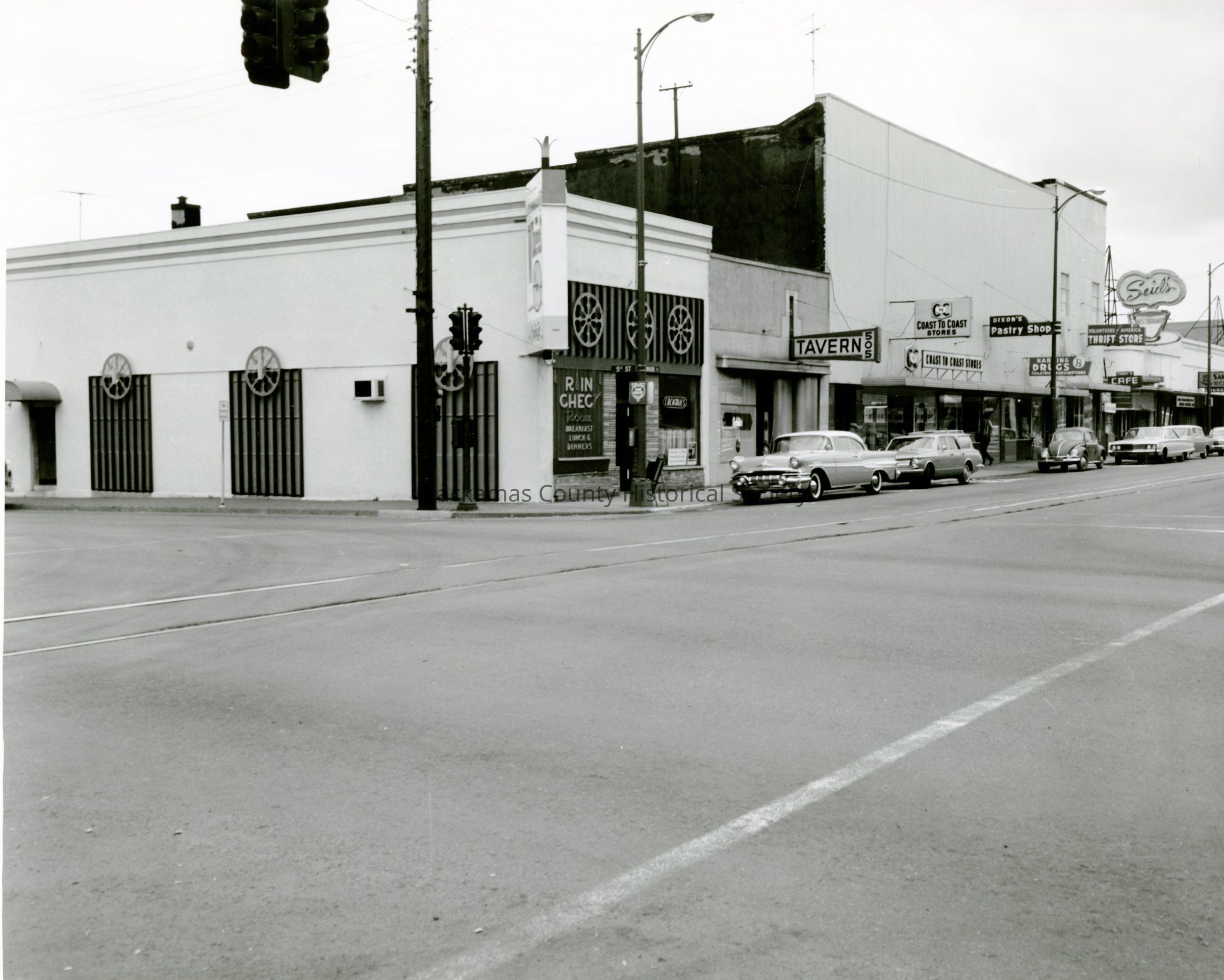 The Wheel, 505 Tavern, Coast to Coast Store, Dixon's Pastry Shop, Harding (sp?) Drugs, Thrift Store, Seid's Restaurant