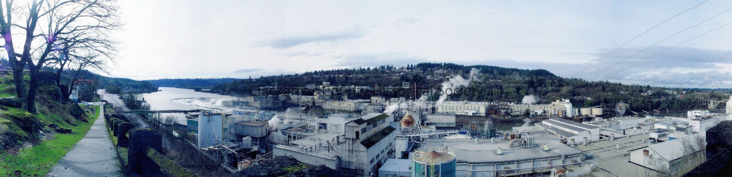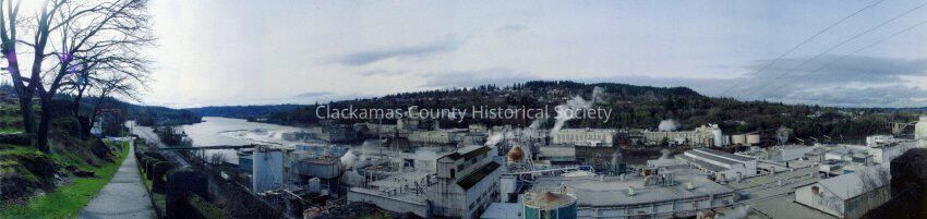Color panoramic view of Oregon City, Oregon from the Promenade looking upstream. View of Oregon City and West Linn Mills.