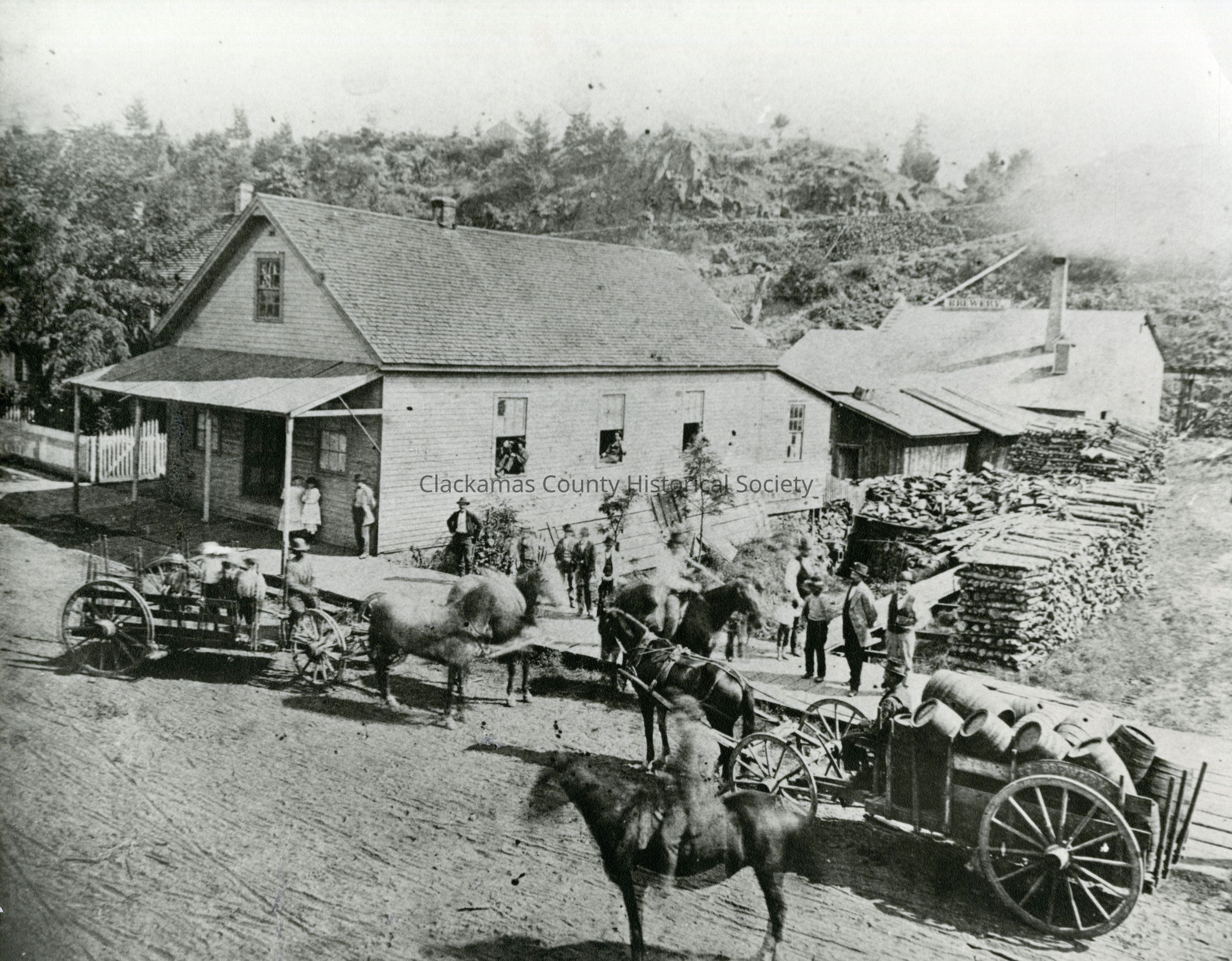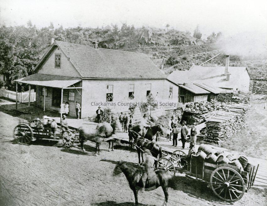 Oregon City Brewery, 8th and Main Streets, Oregon City. Second Building. Native Americans on single horses.