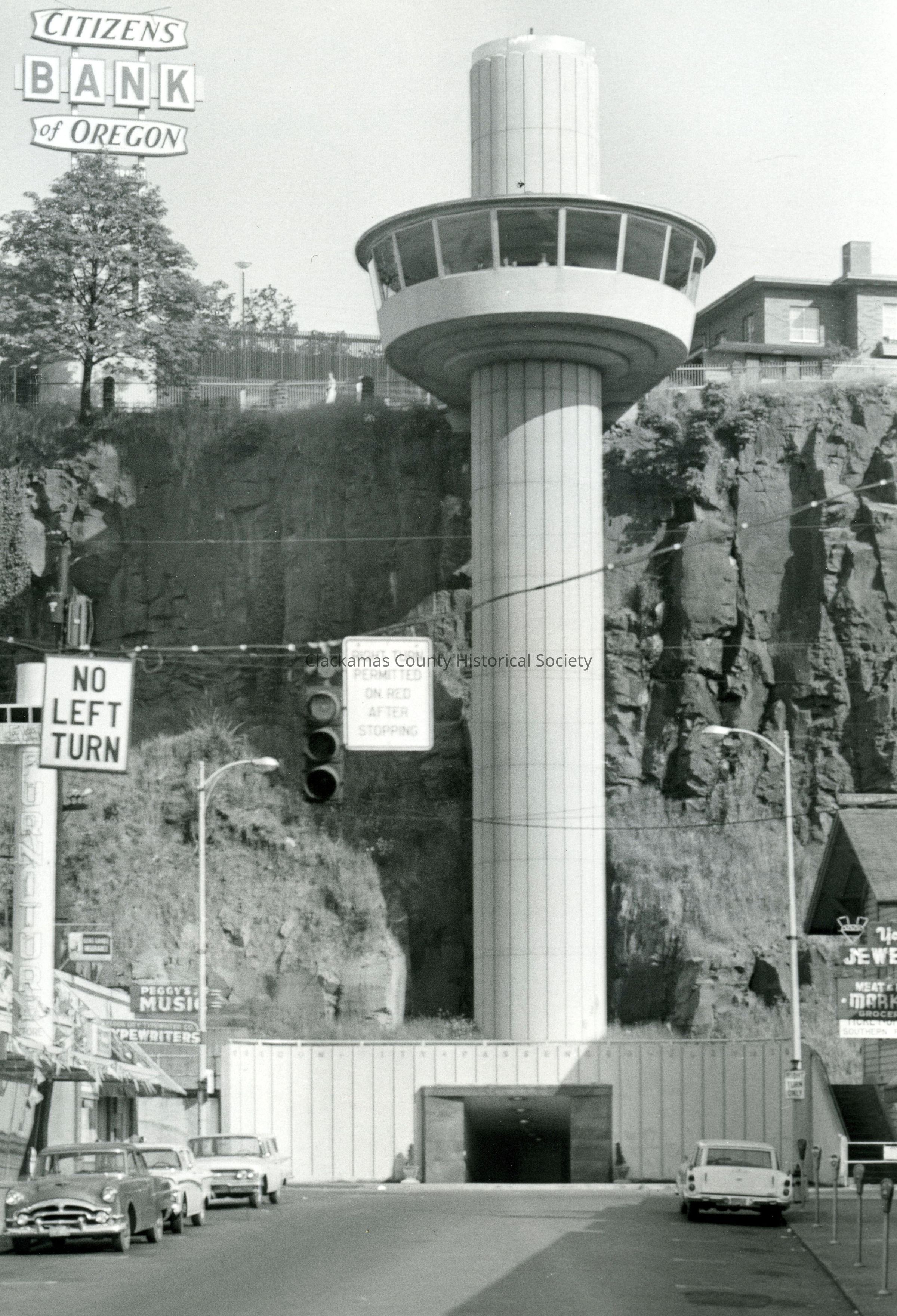 Oregon City elevator. Citizens Bank of Oregon. Peggy's Music. Young's Jewelry. Other businesses. Cars on street.Made/Created