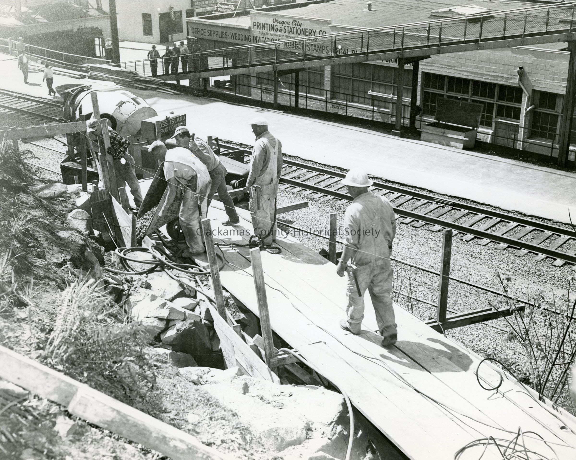 Oregon City elevator. 1954. Construction showing hauling cement in wheelbarrows to forms, pouring to forms, air cylinders, train depot.