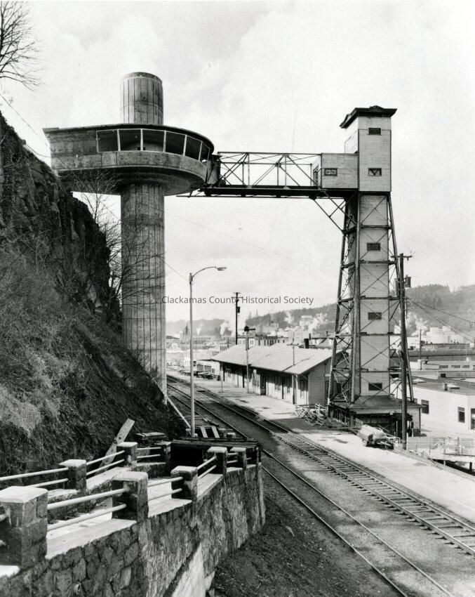 Oregon City elevator, railroad track and depot, and steps to bluff. Old elevator and new elevator 1954. Old elevator built in 1913.Made/Created
