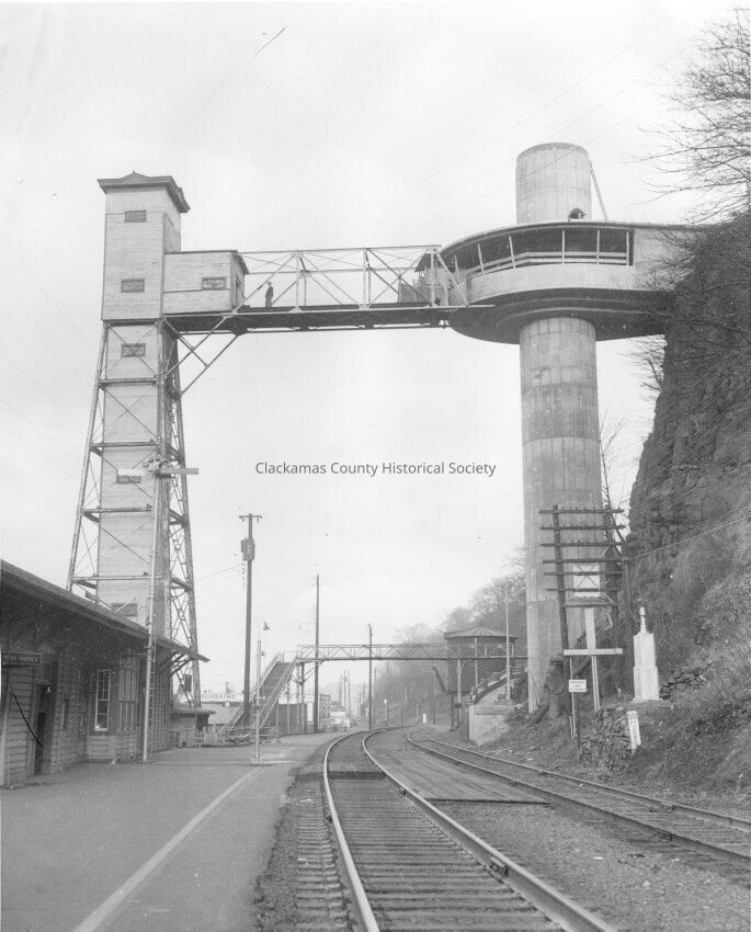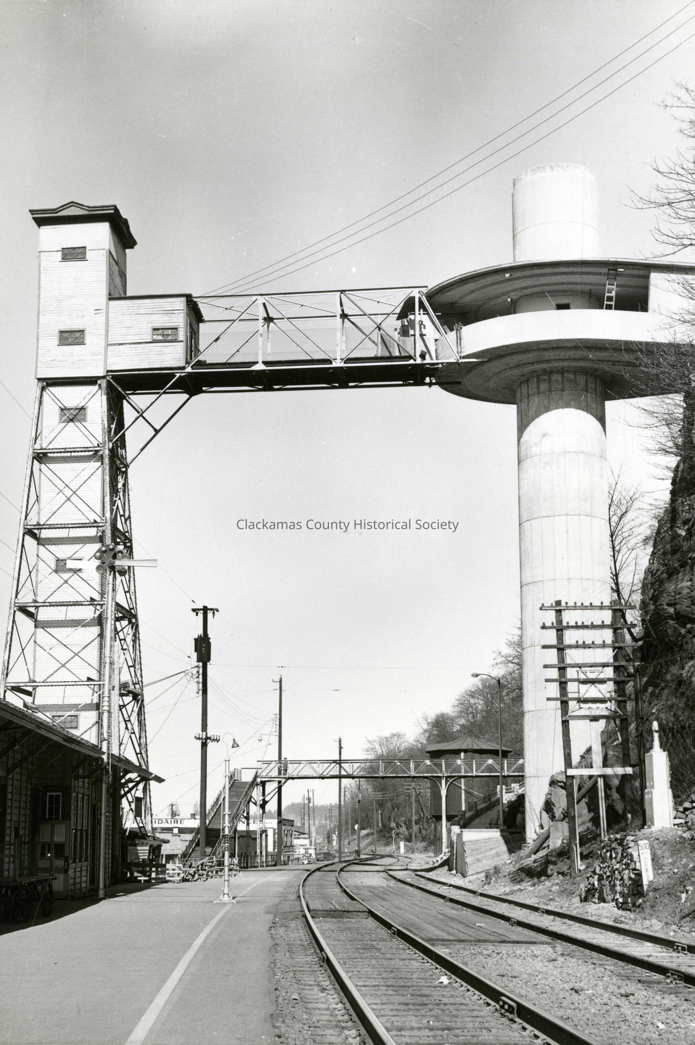 Oregon City elevators. Old and new elevator north view on the railroad tracks. Old stair walkway; water tower. 5x7 and 8x10 photo in packet.Made/Created